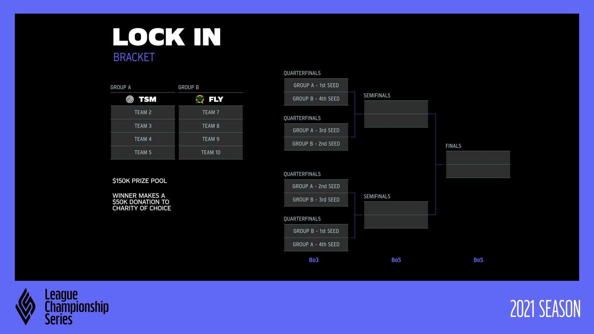 The top four from each group will be seeded into an eight-team, single-elimination bracket to determine the Lock In Champion. The winner starts 2021 off with a bang -- securing a $150K prize (plus an additional $50K towards a charity of their choice) and side selection for Game 5 of the regular season (if head-to-head is tied).
