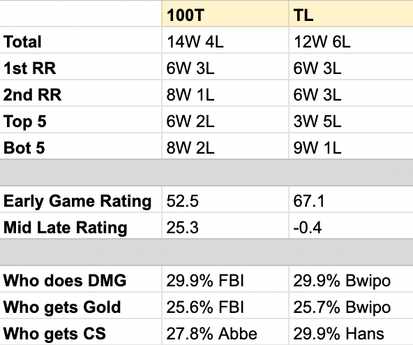 There are a number of standout stats in this matchup. First off, the 25.3 Mid-Late Rating is the 2nd highest ever since this stat has been tracked (2017). As a note, Mid-Late rating has direct correlation with Early Game rating. Essentially, Early game rating is the % chance a team has to win a game based on their early game. So if 100T had a 52.5 EGR, but then won 100% of their games, their MLR would be 47.5 (since 100 - 52.5 = 47.5). So to have such a high mid-late rating, this shows that 100T’s early game is decidedly average. This could be due to a number of factors. They did have a slow start to the split, with VERY weak early games. They’ve also heavily prioritized late game picks – so that will naturally deflate their early game stats. Even so, being 8-1 in the 2nd half, and so reliably winning games in the mid and late stages make 100T a powerhouse going into playoffs.