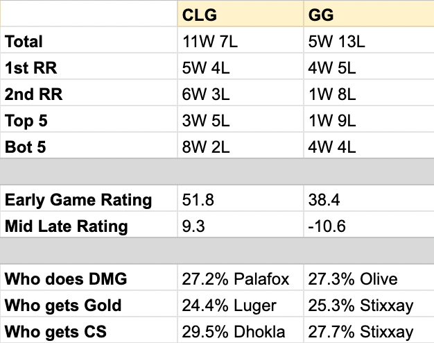 In preparation for this round of playoffs I did some digging into stats to see if it could give me a clearer picture of where teams stand. I checked how each team performed in the 1st round robin compared to the 2nd (to see a positive or negative trajectory). I checked what their record was versus the top 5 teams in the LCS and checked their record versus the bottom 5 teams in the LCS. I also checked teams’ “early game rating (EGR)” and “mid-late rating (MLR)”, two stats from oracleselixir.com that I find quite useful to see if teams are stronger in the early game or in the late game.