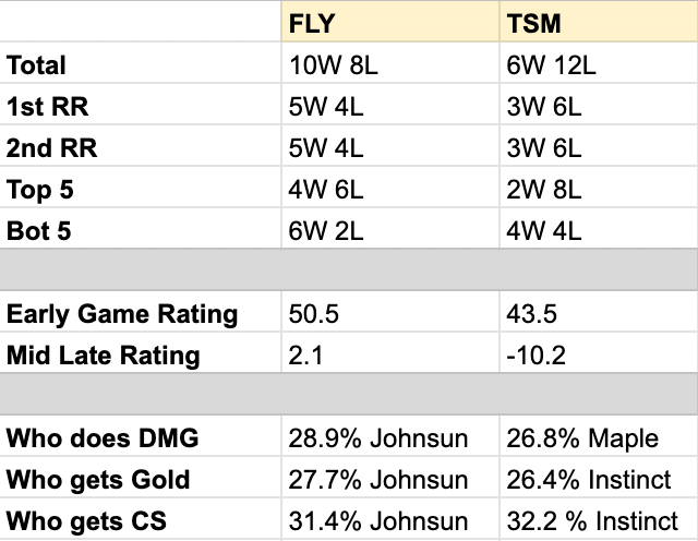 So what do these stats tell us? For me, it makes me think that I’ve been distracted and overfocused on Toucouille and Josedeodo. With Toucouille receiving more Player of the Game awards than any other player in the LCS, and Jose being so active early game it had me defining FLY as a mid-jungle team. What these stats show is that this team plays heavily around Johnsun. FLY is one of only two playoff teams (with EG Danny being the other) to have DMG, Gold, and CS% held by the same player. I think whether or not Johnsun can have a stable early game will be extremely important for FLY in this series.