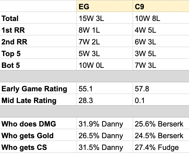 When I mentioned 100T had the 2nd highest Mid Late Rating ever, I neglected to mention that EG had the 1st. It’s actually incredible how they’ve team fought their way to victory so consistently this split. They continue to not blow people out in the early game (and have even been blown out in the early game by TL) but have put together the best regular season in their org’s history. So much of their success revolves around Danny. He just gets so much of everything. His laning phase isn’t particularly dominant, but EG will often play portions of the mid-game almost 4-5 so that Danny can get farm and solo turret gold. They do this because he’s so damn good in teamfights. The “concern” for EG is that their early game may be a bit exploitable against a talented team (like C9), and that they had a worse record in the 2nd half of the split than the first.
