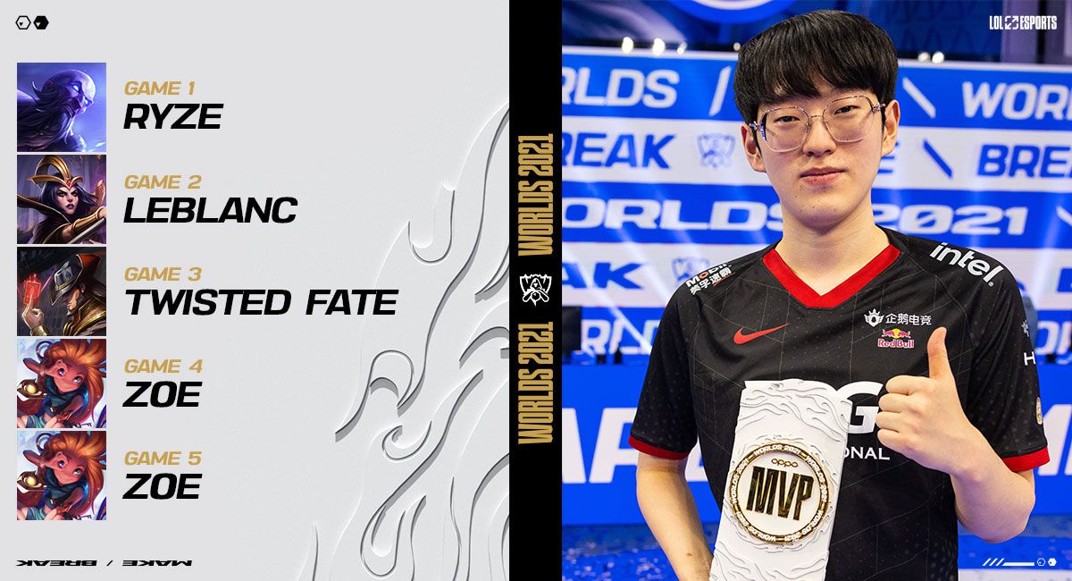 Edward Gaming mid laner Lee “Scout” Ye-chan earned the Worlds 2021 final OPPO MVP award for his outstanding performance while playing four different champions across the five games against DWG KIA.