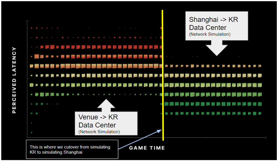 Remember that the purpose of the Latency Service is to equalize latency regardless of the natural network ping. If we changed the network ping characteristics in the lab, the expectation would be that the Latency Service would compensate and thus the latency measurements should stay the same. However, that is not what the data showed us. As you can see, the data showed that the latency measurements were lower in the Shanghai network simulation than they were for the KR network simulation. This was unexpected and shows that the Latency Service is producing a higher latency for the Korea environment than for the Shanghai environment.
