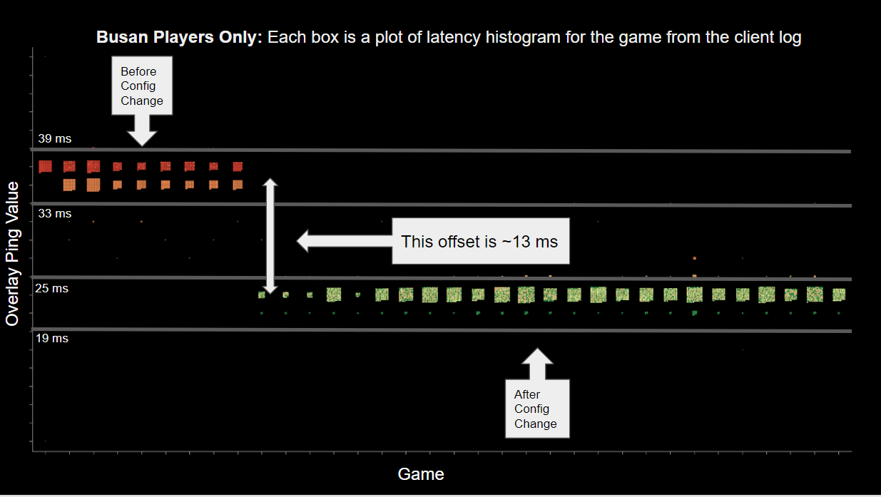 To reiterate the reasons for this, in Shanghai the ping numbers are correct because they are already at the latency target of 35 ms, so no compensation was added to their experience. The reason the Busan numbers are incorrect is that latency configuration offset corrected the ping miscalculation in the engine so the real ping would be equalized to ~35 ms, but this had the downstream effect of offsetting the logs and the onscreen display of the ping by about 13 ms.