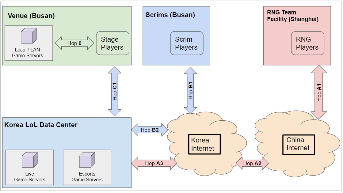 What we realized is that the players in the MSI venue were playing on ping that was worse than 35 ms, while the remote team in Shanghai was playing at the desired 35 ms ping range - which is the natural latency between Shanghai and Busan - we had not achieved the ping parity required for fair play.