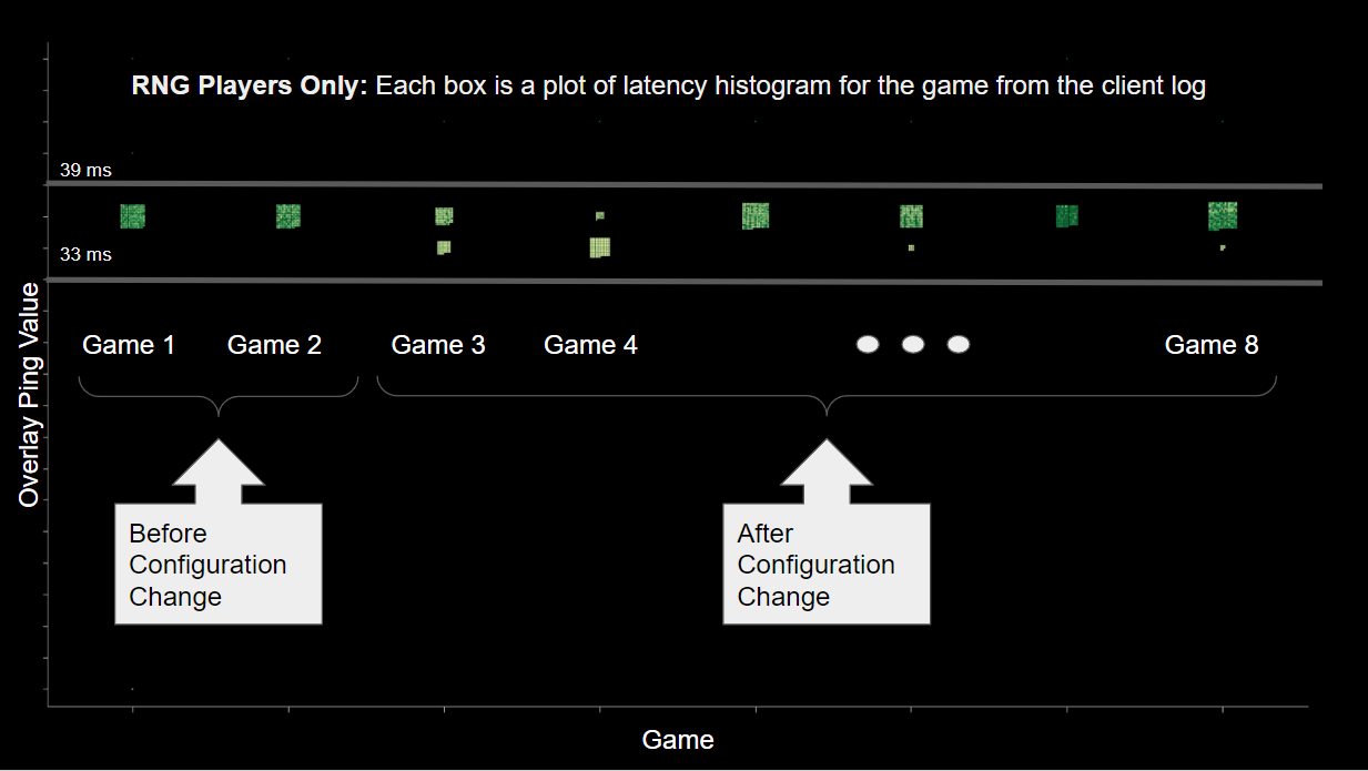 We needed to tell the teams immediately. The only open question was whether the difference was significant enough to require that the games be replayed. This would be a Competitive Operations call. Our estimations put the latency disparity somewhere in the 15-20 ms range, which drove the difficult decision to remake the three impacted games with the new configuration change to ensure competitive integrity.