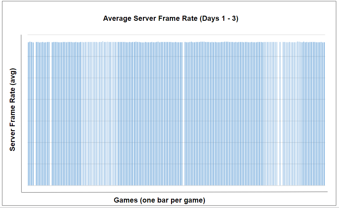 As an example, one hypothesis that we had was that maybe the game server was not keeping a steady frame rate. So we scraped the logs from all the games for the first few days and put the data into a viewing tool to visualize the data into the graph above. What this showed is that we had consistent frame rates on the server from one game to the next. The data indicated that the game server performance was stable, so it was not likely to be the cause of the inconsistent responsiveness that was reported by the pros.