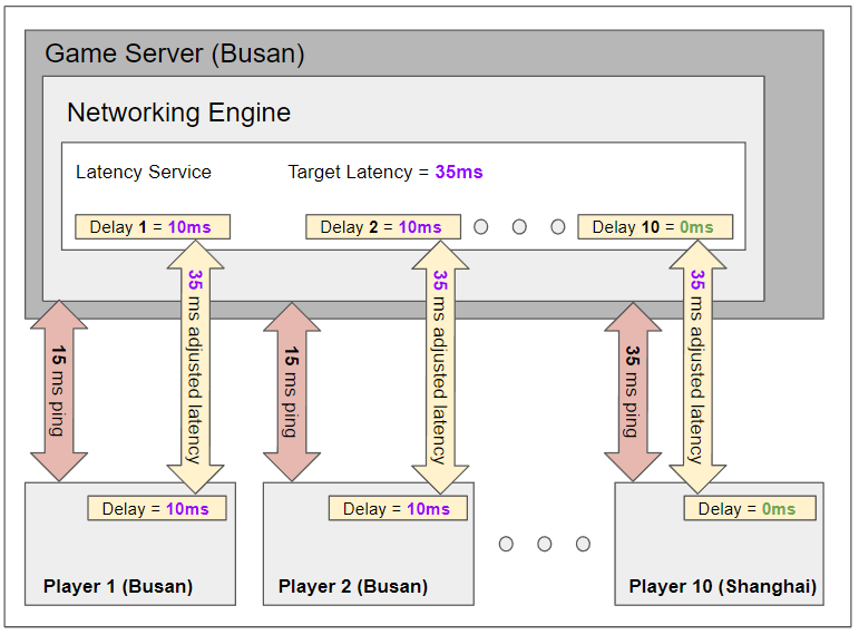 The diagram above shows the various components of the system. On the top side of the diagram, you can see the game server components and the bottom side of the diagram shows the client (the player’s PC). In this example, the Latency Service is configured to equalize at 35 ms. The red arrows in the diagram indicate the actual network latency that is present. As you can see, Player 1 and Player 2 in Busan show an “actual” ping of 15 ms, while Player 10 in Shanghai shows 35 ms ping. The yellow boxes indicate how much delay is introduced artificially on the client and server side. In this case, Player 1 and Player 2 each have 10 ms of delay added to the client side and to the server side to achieve the target of 35 ms. Player 10 already has real latency that is equal to the target latency of 35 ms and thus has no delay added (0ms).