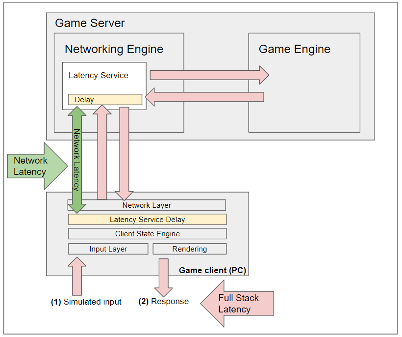 The diagram above illustrates this concept. The existing network monitoring system measured the latency at the networking layer as shown by the green arrow. As you can see, it measures everything between the networking layer and the Latency Service delay. The updated monitoring tool measures latency along the red arrows. This includes everything from the input layer through the networking layer to the game engine on the server and then back again to the client.