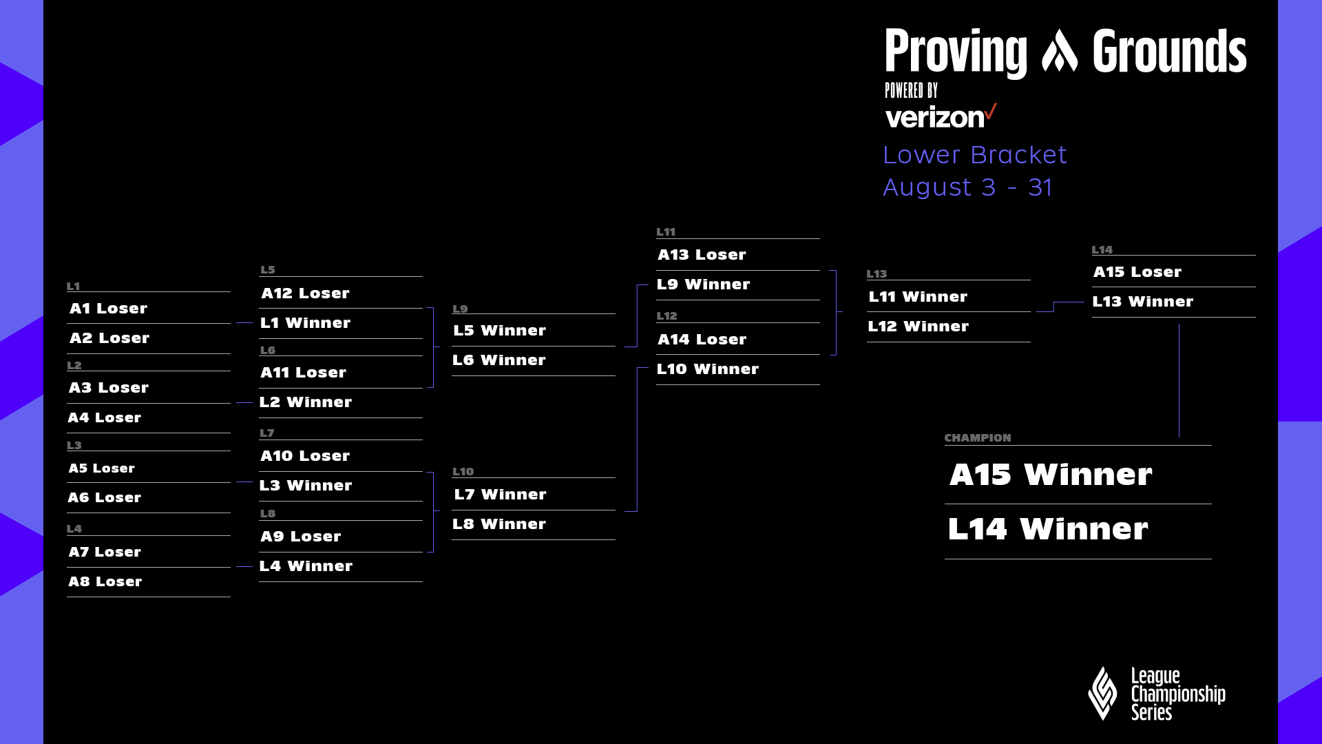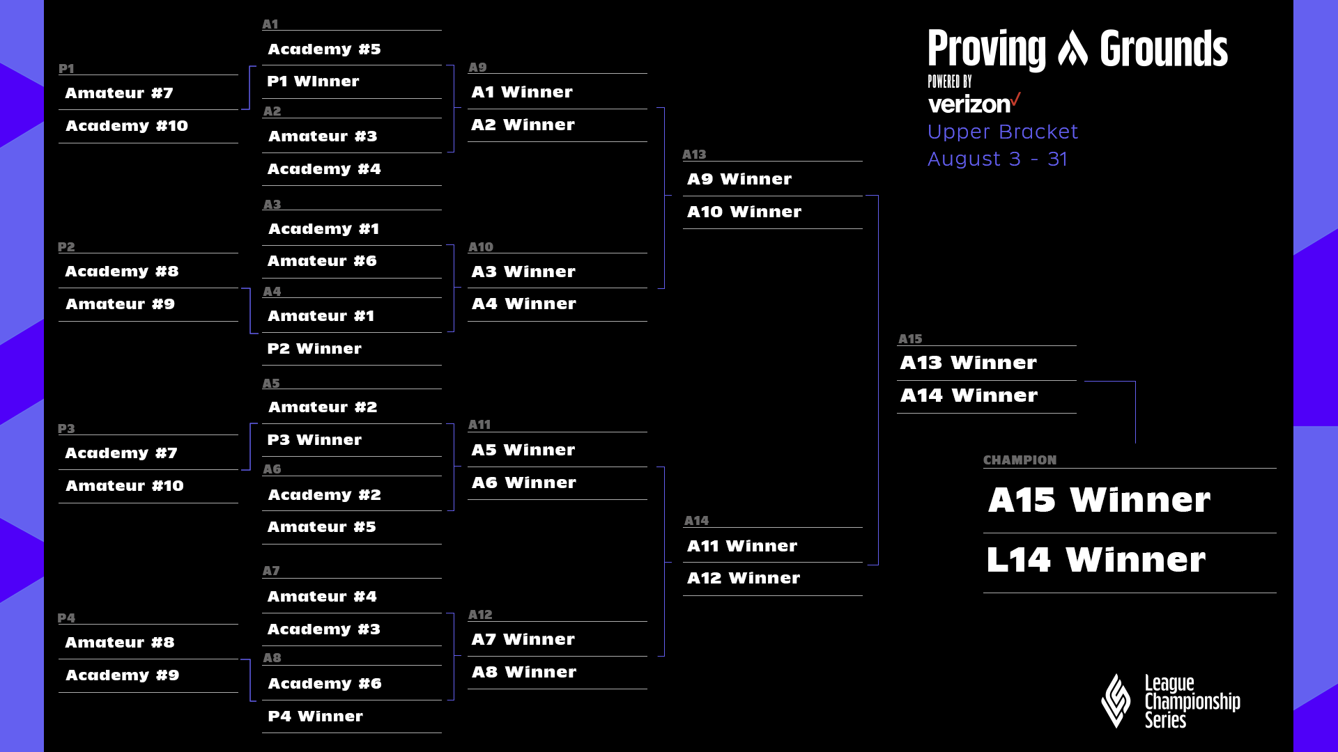 The capstone event of Summer Academy and Amateur competition, Proving Grounds Summer, is a 20-team, double elimination bracket that pits all 10 Academy teams against the top 10 points holders from the Amateur Proving Grounds Circuit Events. The bottom four Academy seeds will face the bottom four Amateur seeds in four single elimination, best-of-three Play In matches to enter the main bracket. The final four teams will play their remaining matches on LAN at the LCS Studio, where we’ll crown a Proving Grounds Summer Champion.