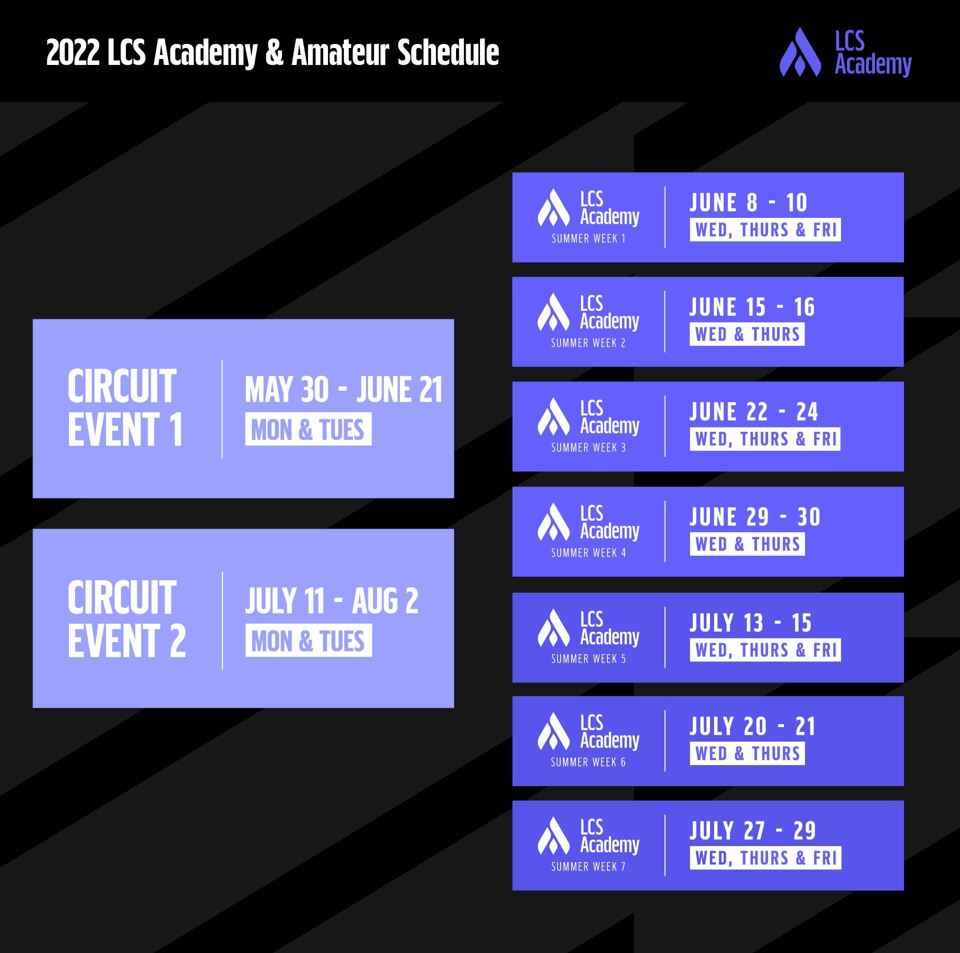 The Academy Summer Split format remains the same as Spring Split: a double round robin with best-of-two matches. The schedule has been consolidated into seven weeks (down from eight in Spring), with a break between Weeks 4 and 5. Four weeks of Academy will have matches scheduled from Wednesday through Friday, with the matches during the remaining three weeks on Wednesdays and Thursdays only. **All match day broadcasts begin at 1pm PT.**