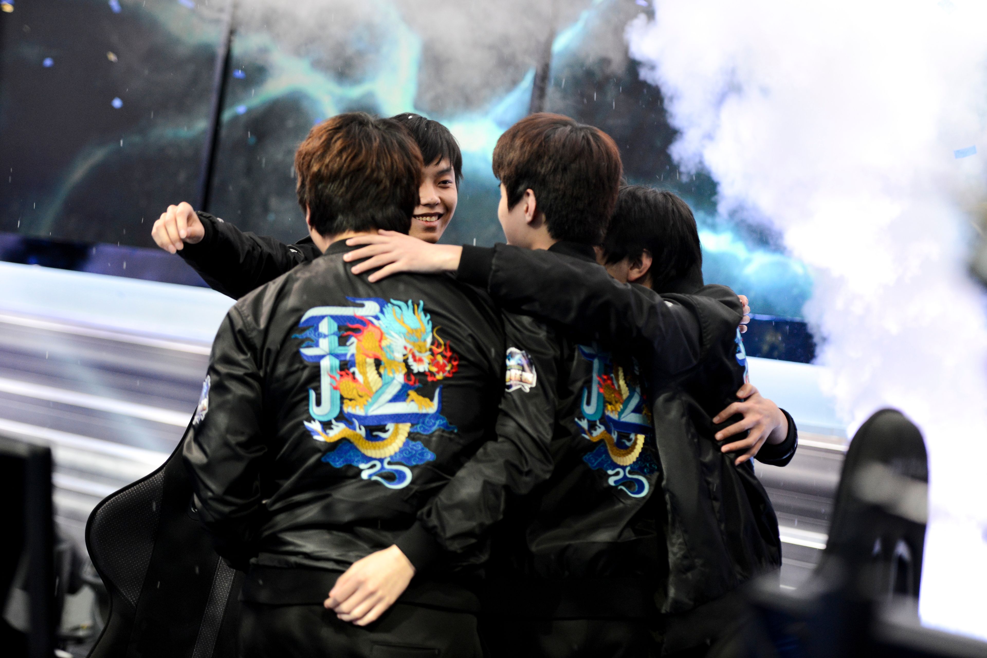 **Photo description:** The members of Edward Gaming hug each other after winning the inaugural Mid-Season Invitational.