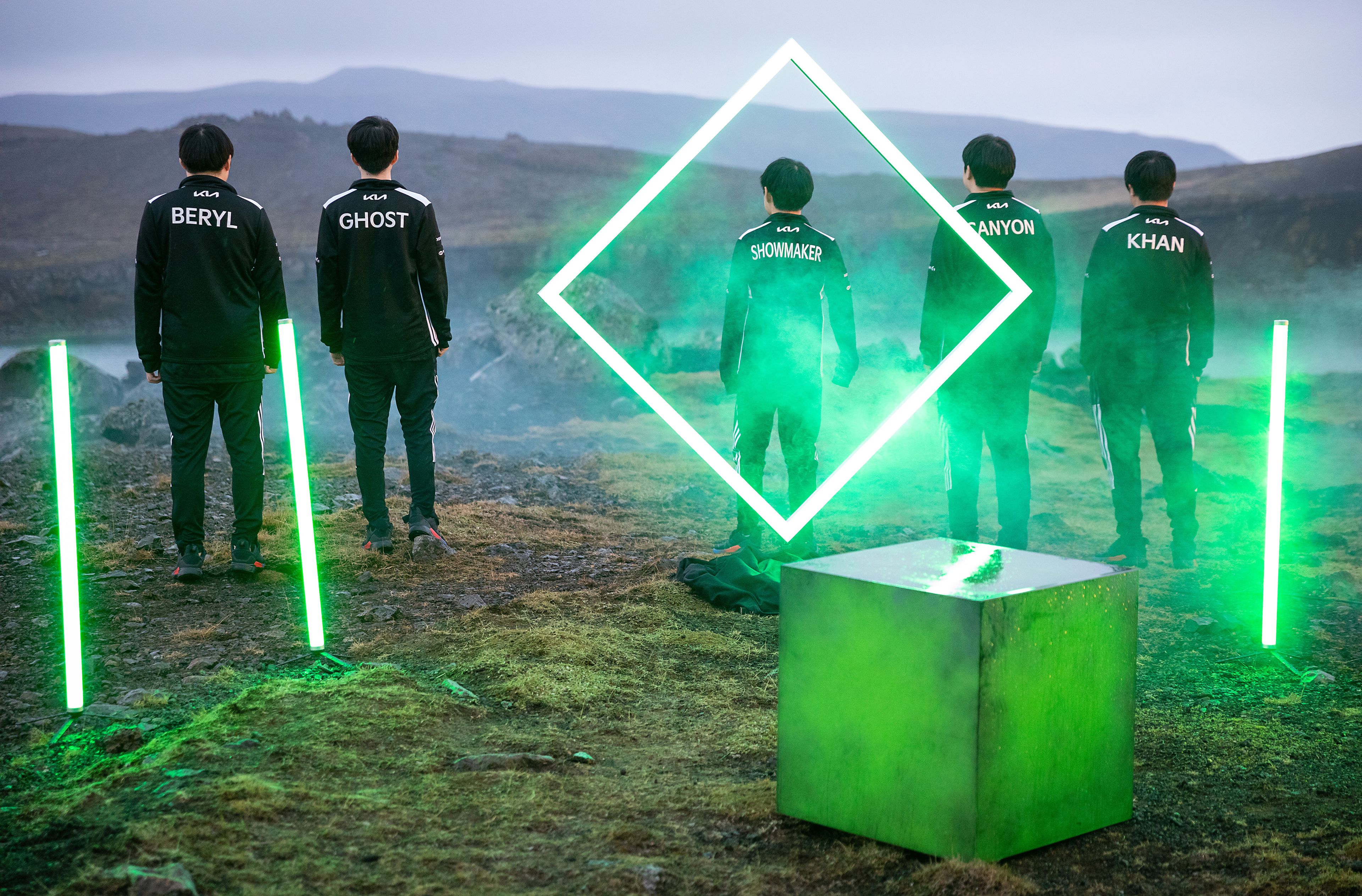 **Photo description:** Damwon KIA stands on volcanic soil with their backs to the camera. Showmaker is highlighted in green in the center.