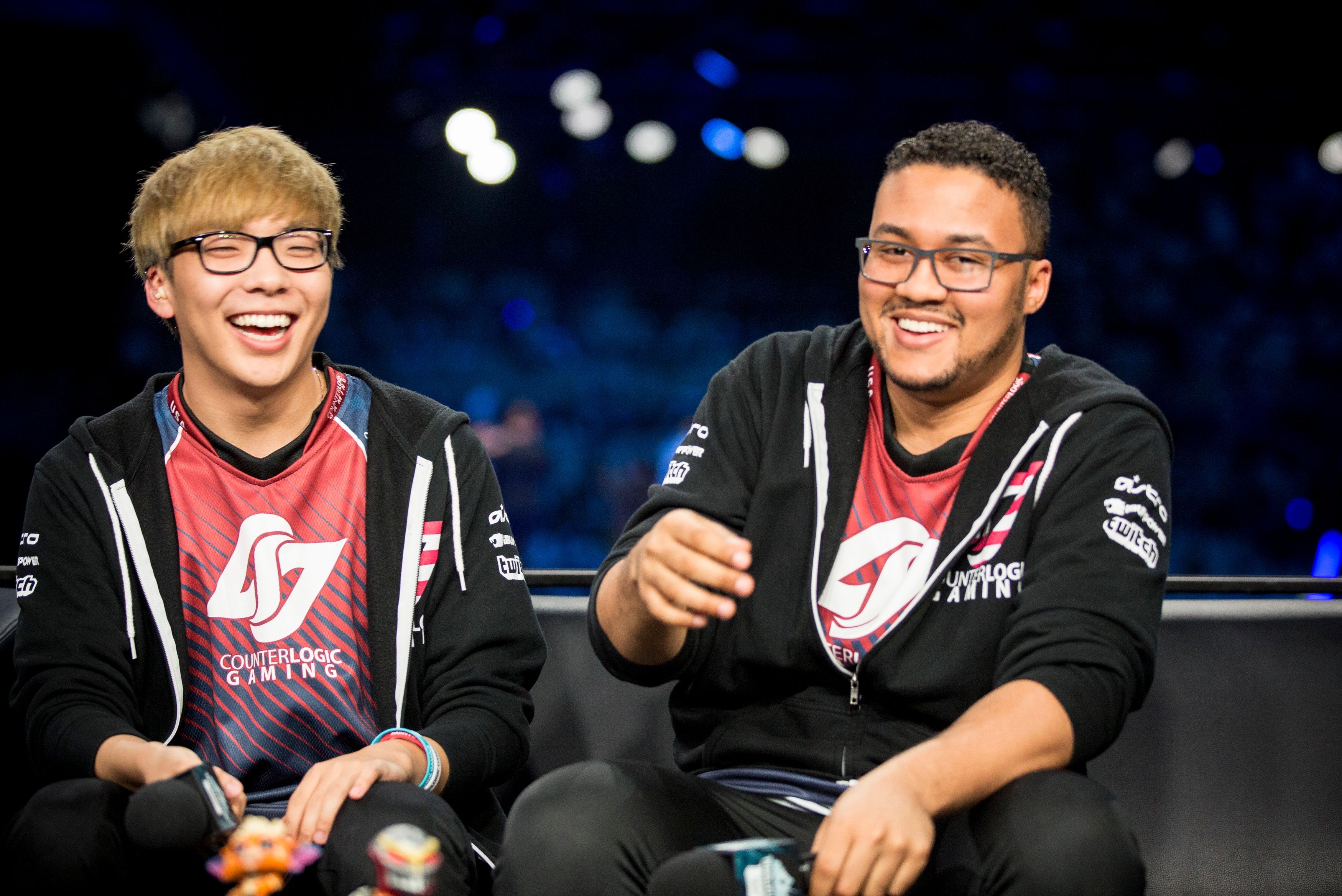 **Photo description:** Counter Logic Gaming's Zaqueri "aphromoo" Black and Choi "huhi" Jae-hyun sit laughing on a couch in a post-match interview.