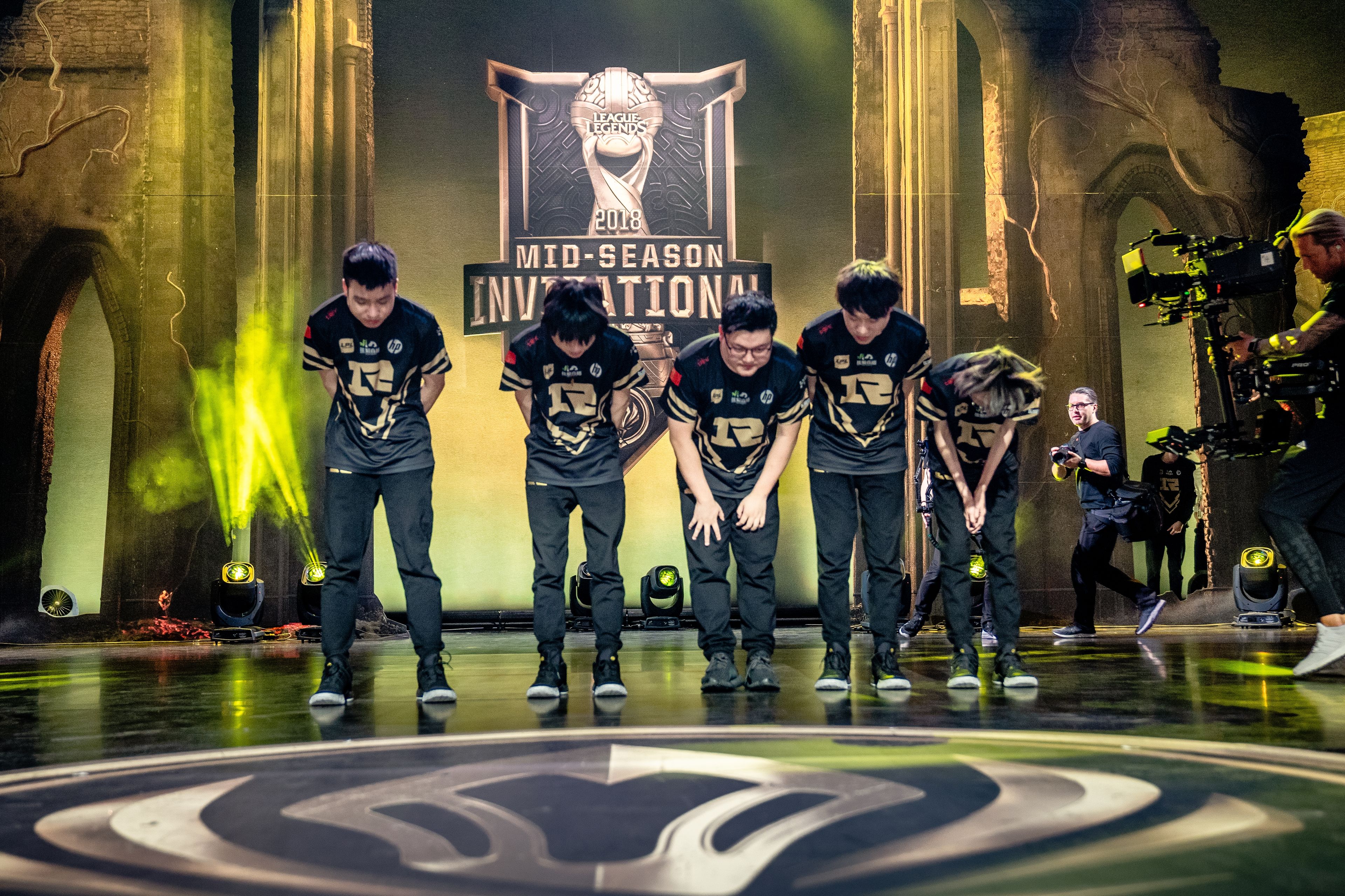 **Photo description:** LPL team Royal Never Give Up bows to the crowd at 2018 MSI.