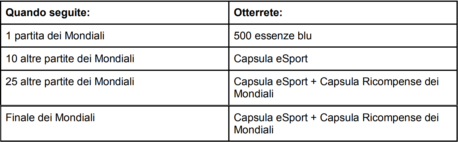 Quando aprirete una **Capsula Ricompense dei Mondiali**, riceverete un oggetto casuale dalla lista qui sotto: