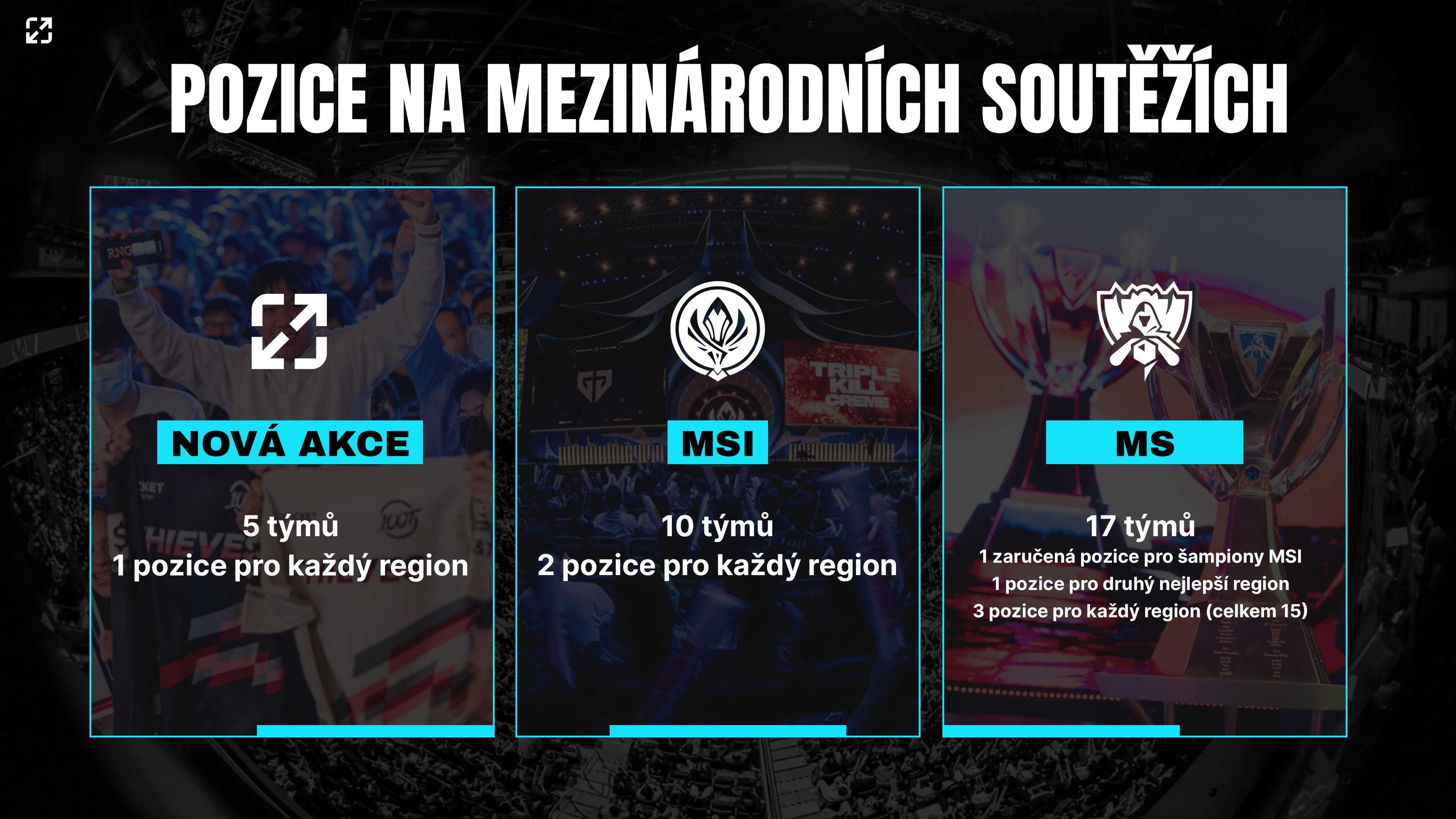 Kvůli potenciálnímu přesunu na pět celkových regionů (Americas, LEC, LCK, LPL a APAC) zaujímáme svěží pohled na naše divize na našich mezinárodních turnajích. Každý region by měl mít jednu pozici v našem novém turnaji (celkem 5 týmů), dvě pozice na MSI (celkem 10 týmů) a tři pozice na mistrovství světa. První a druhý nejlepší region z MSI navíc svým ligám stále zajistí dodatečné pozice na mistrovství světa, takže celkový počet týmů na MS bude 17. MS 2025 bude zahrnovat kvalifikační fázi na 3 vítězné, přičemž vítěz se přidá k dalším 15 kvalifikovaným týmům přímo ve švýcarské fázi.