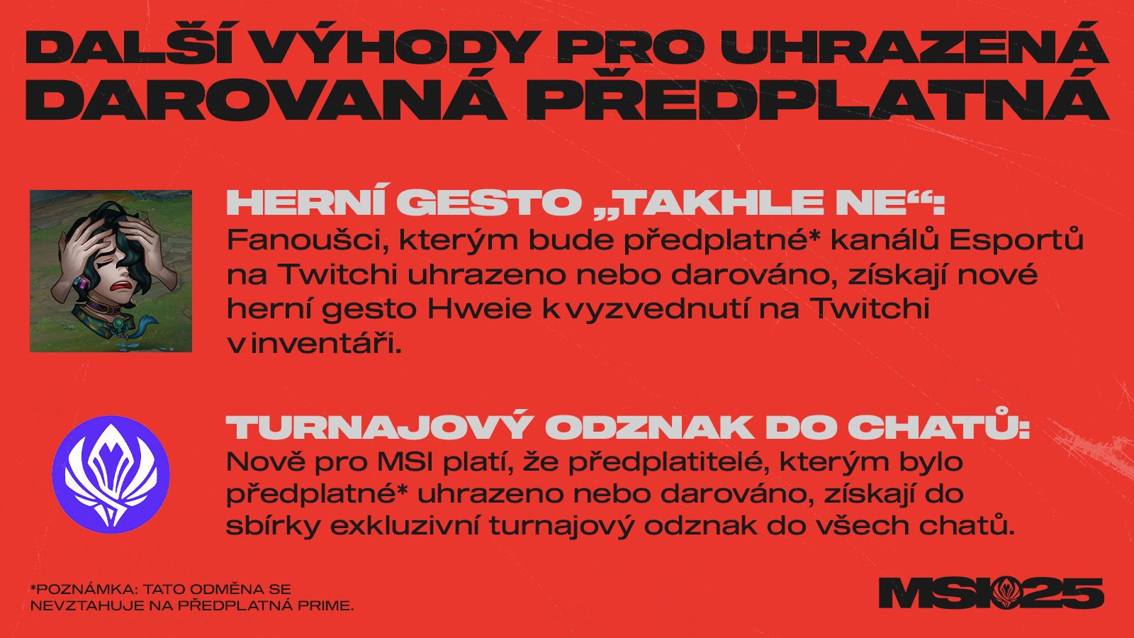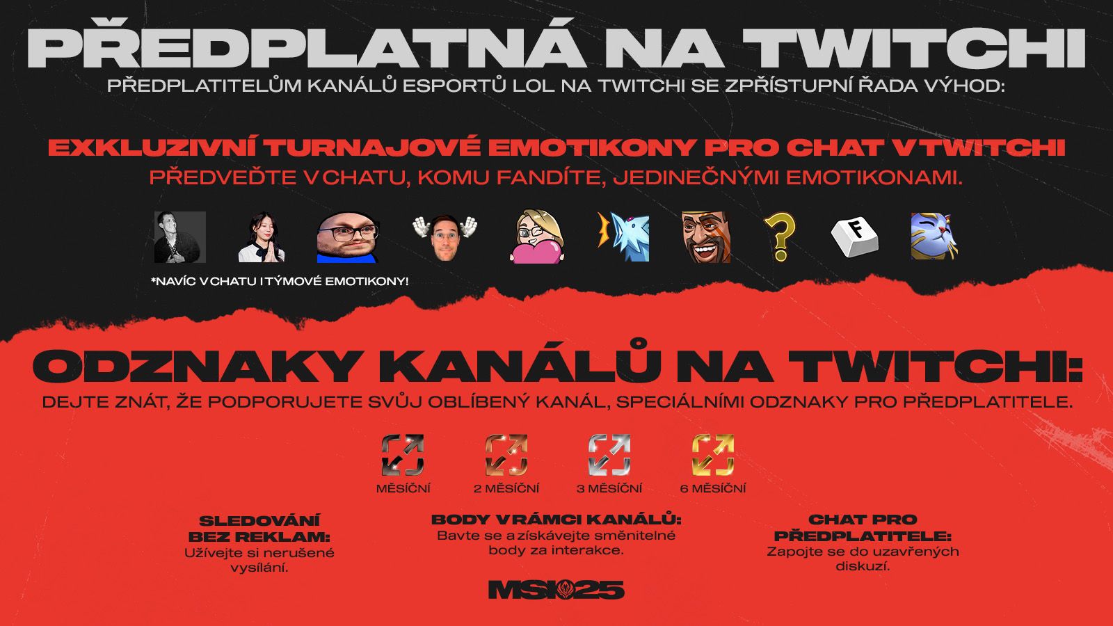 S MSI opět přichází předplatná na Twitchi! Všichni předplatitelé kanálů Esportů LoL na Twitchi se mohou těšit na speciální emotikony v chatu, odznaky, sledování bez reklam, zmínku v živých přenosech a další výhody. Připomínáme, že Riot vyhradí část výdělku pro Globální systém příjmů, který přímo podporuje ligy a týmy spadající do ekosystému Esportů LoL.