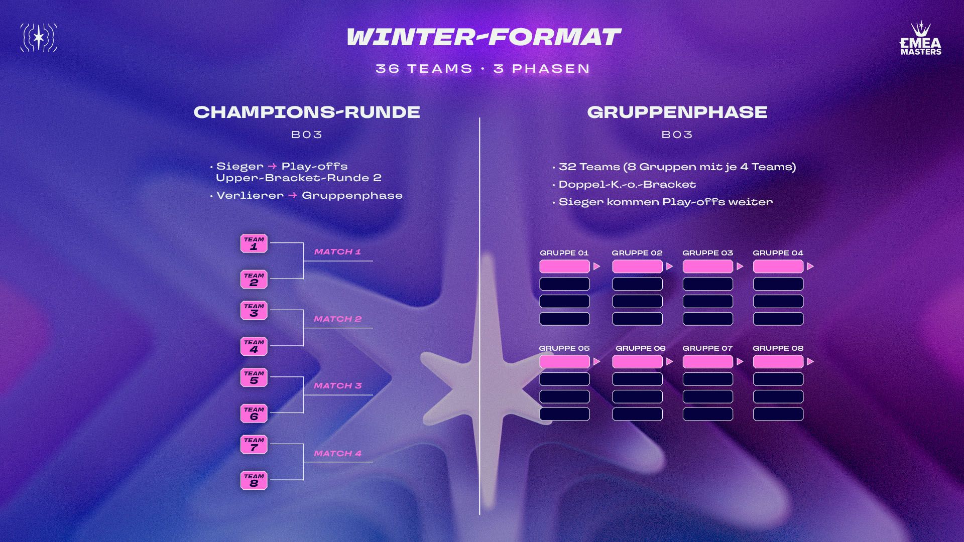 In diesem Jahr werden beim EMEA Masters Winter 36 Mannschaften antreten, die anhand ihrer Platzierung aufgeteilt werden – wobei sich das Format in drei Phasen unterteilt, die mit der Champion-Runde ihren Anfang nehmen.