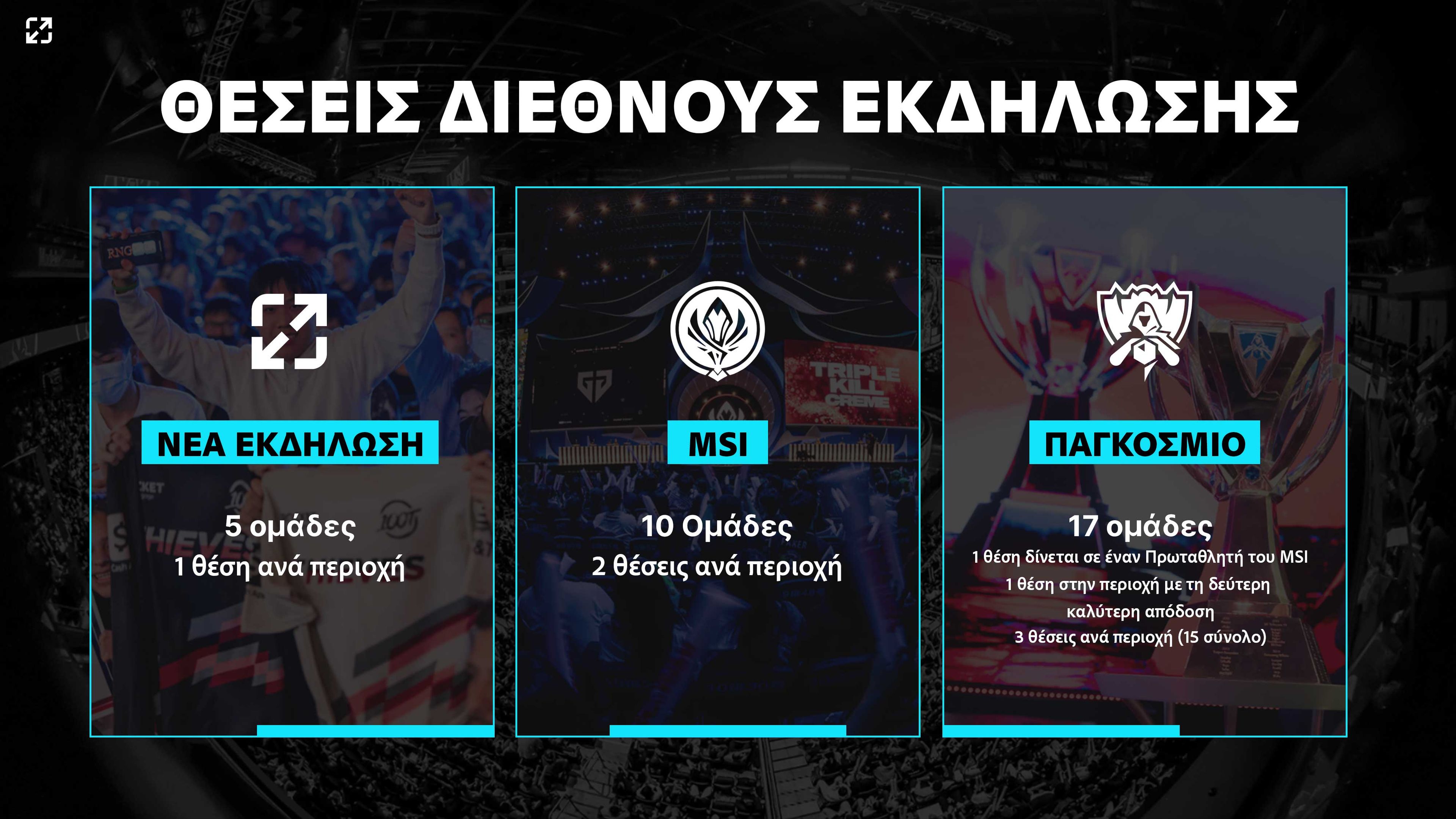 Με μεγάλο μας ενθουσιασμό ανακοινώνουμε τη δημιουργία μιας νέας, τρίτης διεθνούς διοργάνωσης για τα esports του LoL. Οι παίκτες, οι ομάδες και οι φίλαθλοι μας ζητάνε περισσότερα τουρνουά όπου θα συναγωνίζονται οι καλύτερες ομάδες στον κόσμο, οπότε με χαρά θα βρούμε τον χρόνο να προσθέσουμε ένα ακόμα. Ακόμα επεξεργαζόμαστε το όνομα και το brand της διοργάνωσης, αλλά έχουμε πολλές λεπτομέρειες να μοιραστούμε μαζί σας σήμερα.