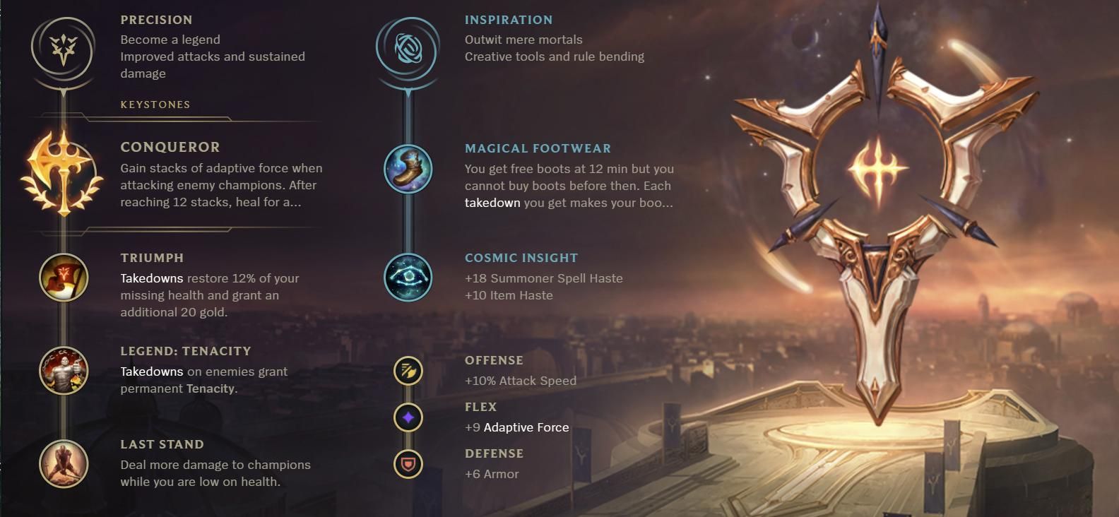 Legend: Tenacity seems to be the go-to choice against heavy crowd control centric team compositions, whereas Legend: Alacrity is popular when the opposing team has less lockdown options. Last Stand and Coup De Grace are interchangeable depending on personal preference. One other thing that is consistent is the secondary runes taken – Inspiration with Cosmic Insight and Magical Footwear are picked every game.