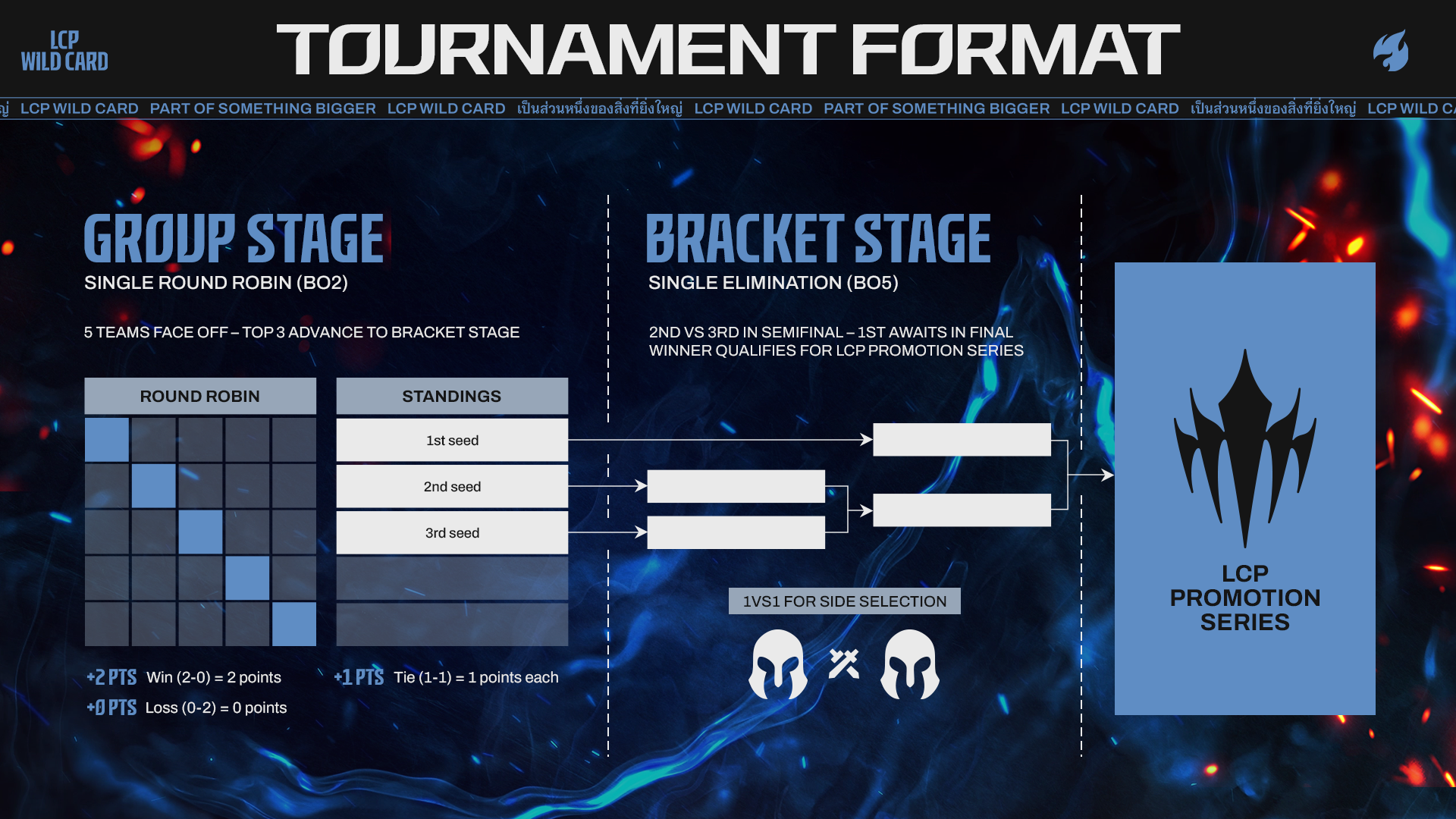 The LCP Wild Card Playoffs will feature five teams battling it out in a Single Round Robin. Each series will consist of two games, with a points-based scoring system used to determine the top three teams advancing to the Bracket Stage.