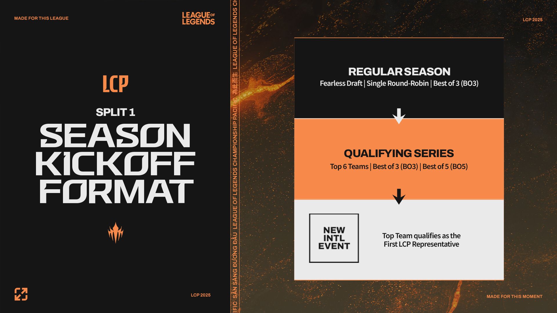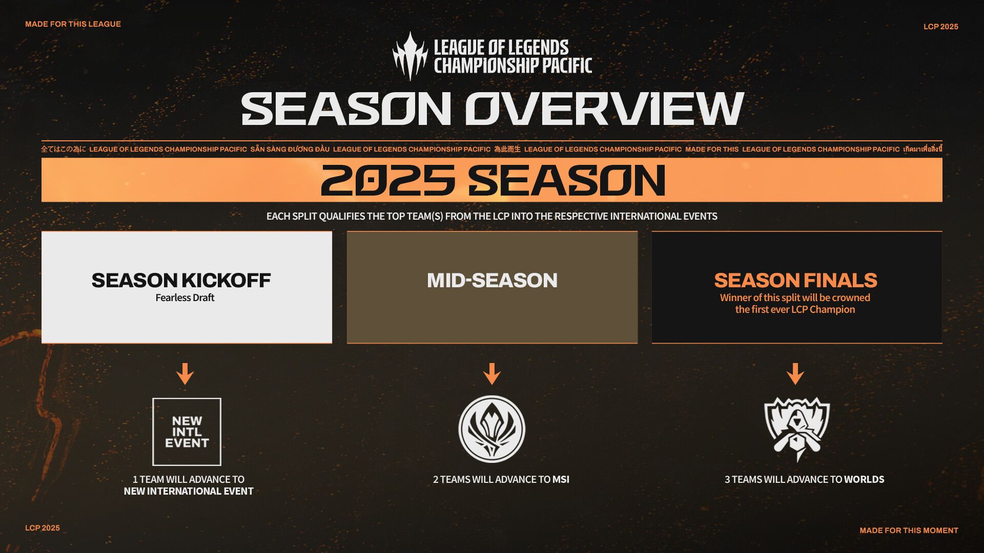 The 2025 season will be divided across 3 splits - Season Kickoff, Mid Season and concluding with the Season Finals. Each split qualifies the best team(s) from each respective regional league into the international tournaments, while the Season Finals winner will become the inaugural LCP champion.