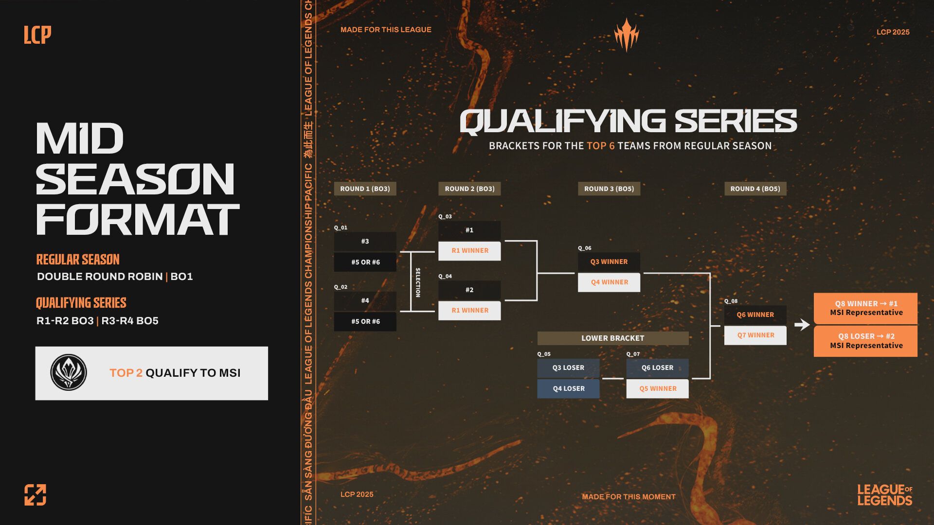 In the Regular Season of the Mid Season split, teams face off in a Double Round-Robin Best-of-1 (BO1) format to determine the top 6 teams moving on to the Qualifying Series. At this stage, teams compete in BO3 matchups for Rounds 1 and 2, followed by BO5 matches in the final rounds where the top 2 teams will secure their spot for MSI. Performance in Mid Season will also impact seeding in the next LCP split - the Season Finals.