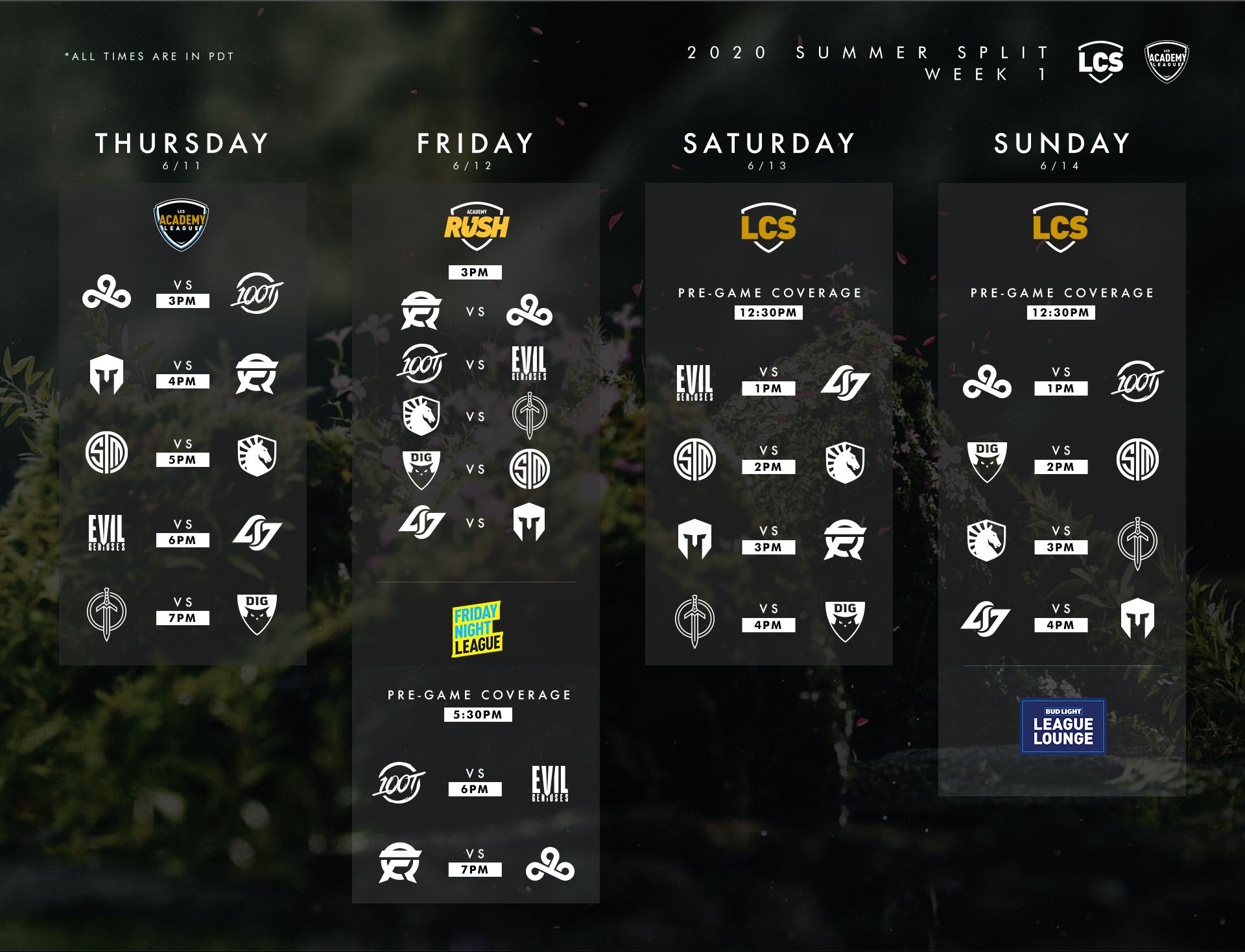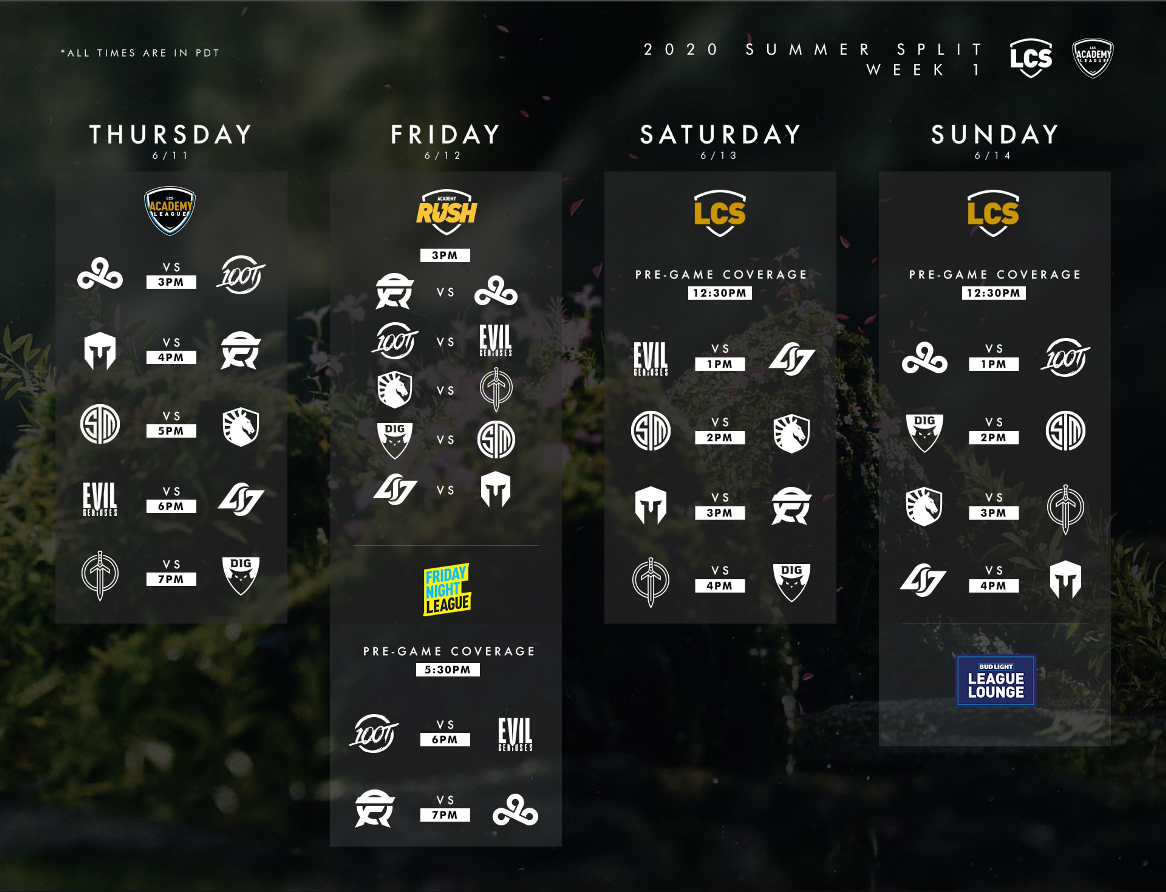 We’re excited to debut Friday Night League at 5:30 PM PT on Friday, June 12 and kick off the Summer with 100 Thieves vs. Evil Geniuses, followed by the Spring Finals rematch of Cloud9 vs. FlyQuest.