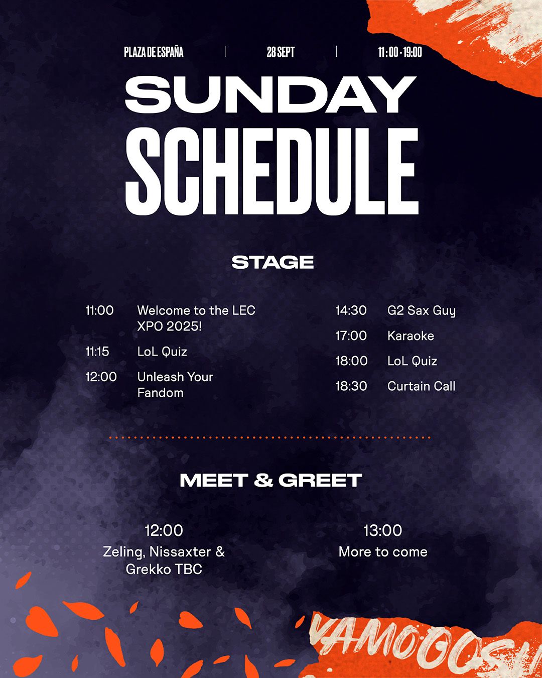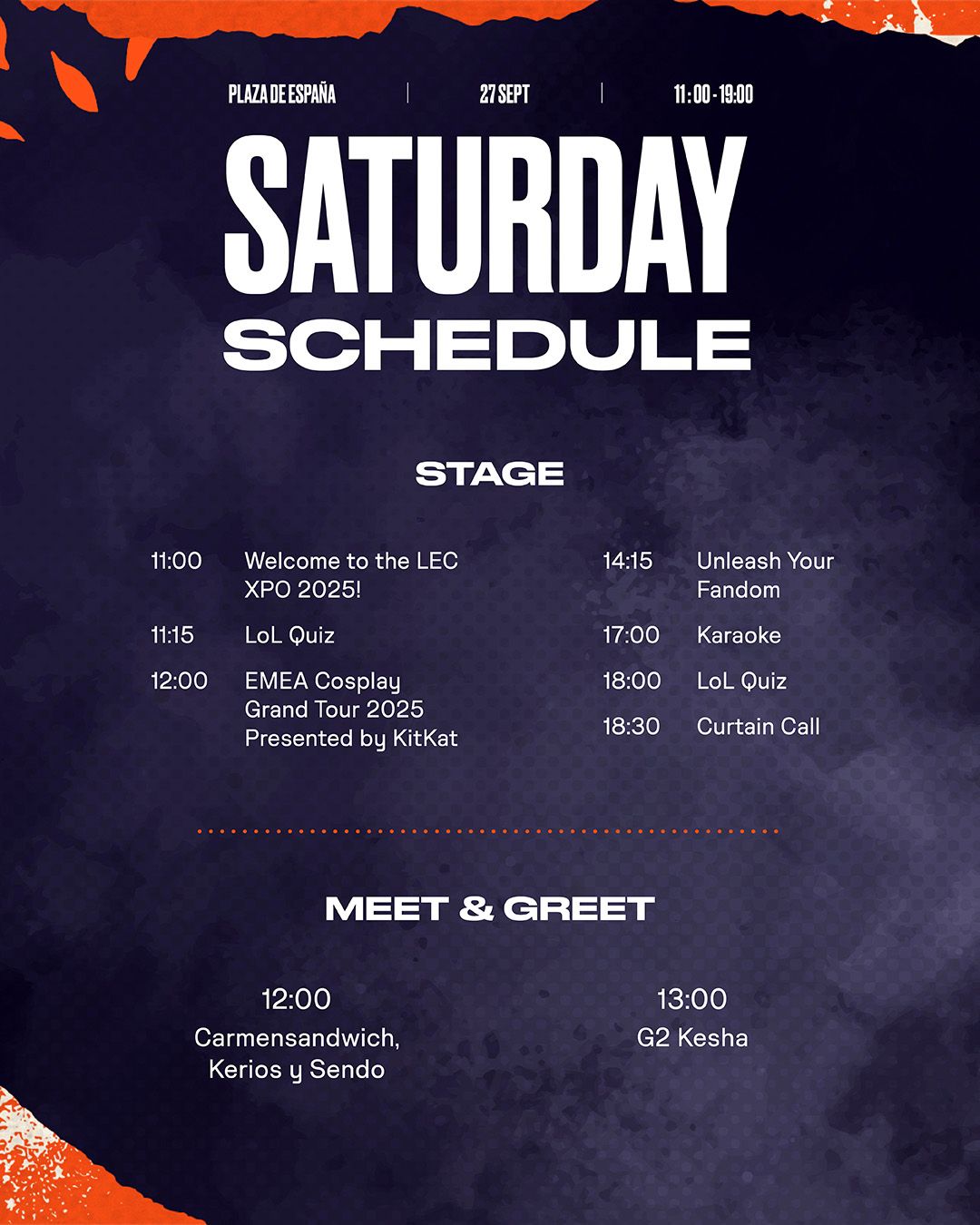 ¿Qué mejor ocasión que la XPO de la LEC para conocer a vuestros jugadores y creadores favoritos, como Tolkin o Kesha? Cada día, entre las 11:00 y las 14:00 (horario peninsular), tendréis la oportunidad de conectar, hacer fotos y compartir el momento con vuestros favoritos. Manteneos atentos, ¡compartiremos el cartel y el calendario completo en redes sociales próximamente!