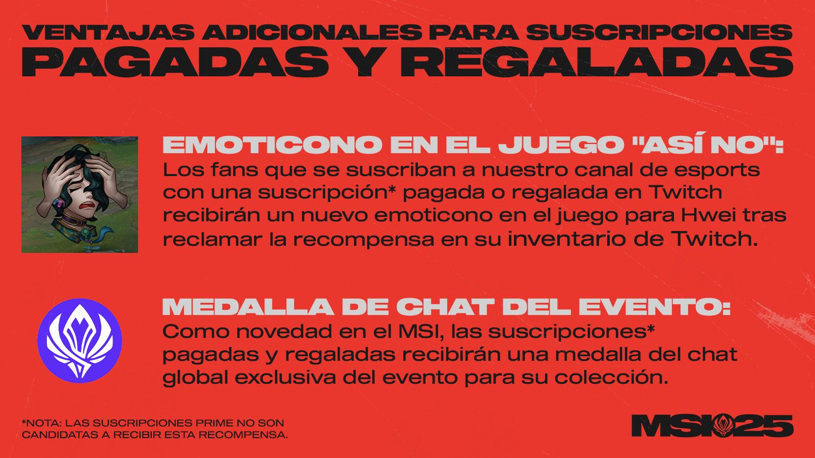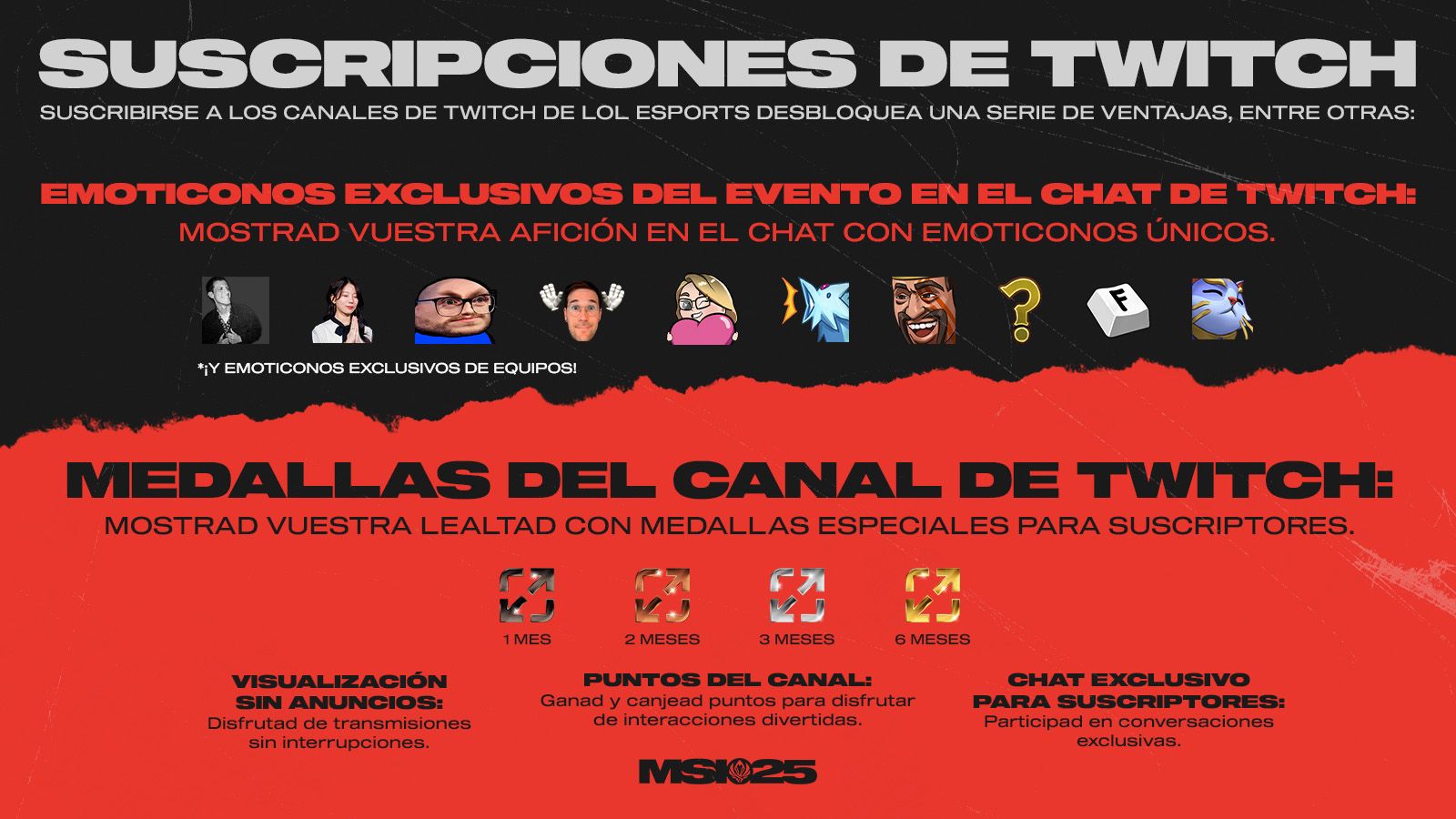 ¡Vuelven las suscripciones de Twitch durante el MSI! Todos los suscriptores de los canales de LoL Esports en Twitch disfrutarán de beneficios como emoticonos personalizados en el chat, visualización sin anuncios y reconocimiento durante las retransmisiones en vivo. Os recordamos que Riot asignará una parte de los beneficios al fondo de ingresos global, que sirve para apoyar directamente a las ligas y a los equipos del ecosistema de esports de LoL.