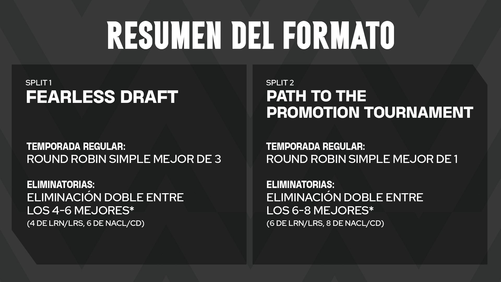 Split 1 - Fearless Draft: Todas las series se jugarán con el formato Fearless Draft, con un Round Robin único de mejores de 3 en la temporada regular y eliminatorias a doble eliminación.