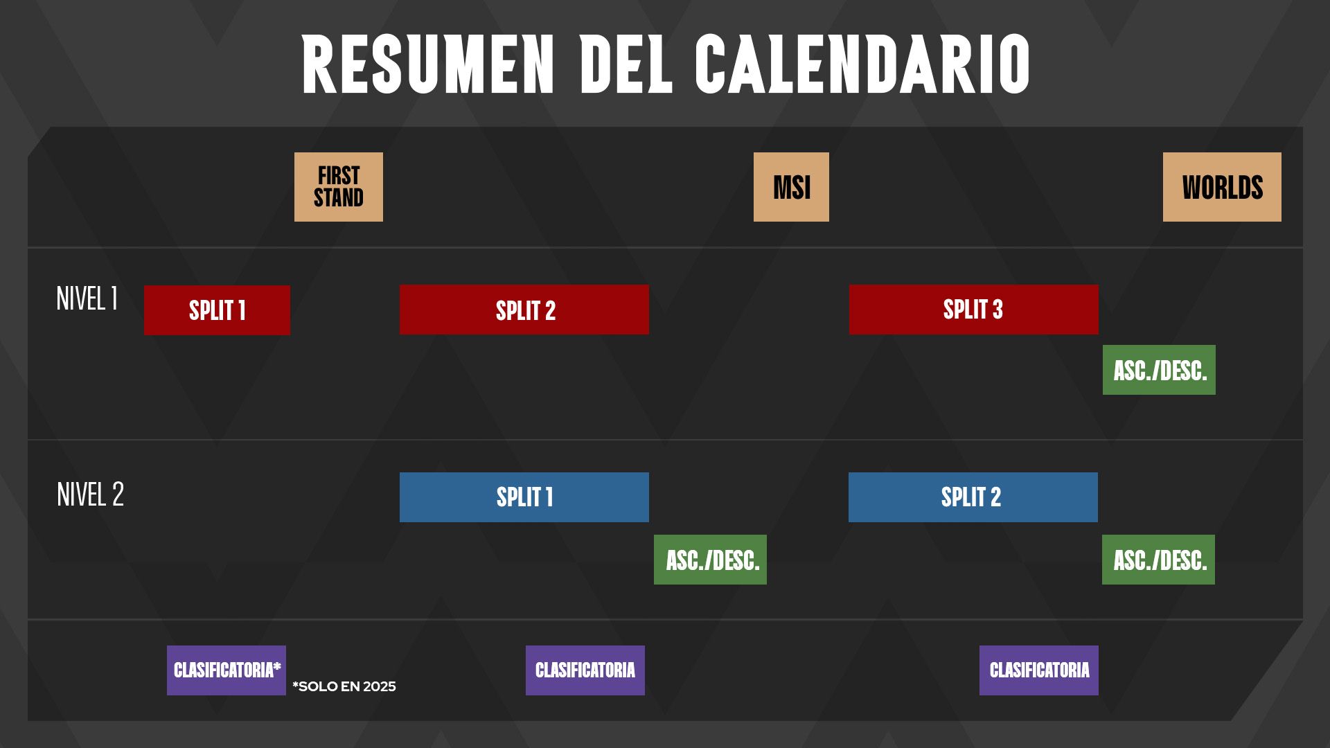 Cada split competitivo ofrecerá oportunidades para que nuevas organizaciones y jugadores compitan por acceder al Nivel 2. Cada liga del Nivel 2 incluirá torneos clasificatorios que crearán una trayectoria directa desde la competencia amateur hasta Worlds. Esto también significa que los equipos de Nivel 2 con peores resultados en cada split tendrán que defender su plaza en los Torneos de Ascenso de Nivel 2. Compartiremos más detalles sobre cómo inscribirse en estas clasificatorias, así como las normas de ascenso y descenso de Nivel 2, a comienzos del año que viene.