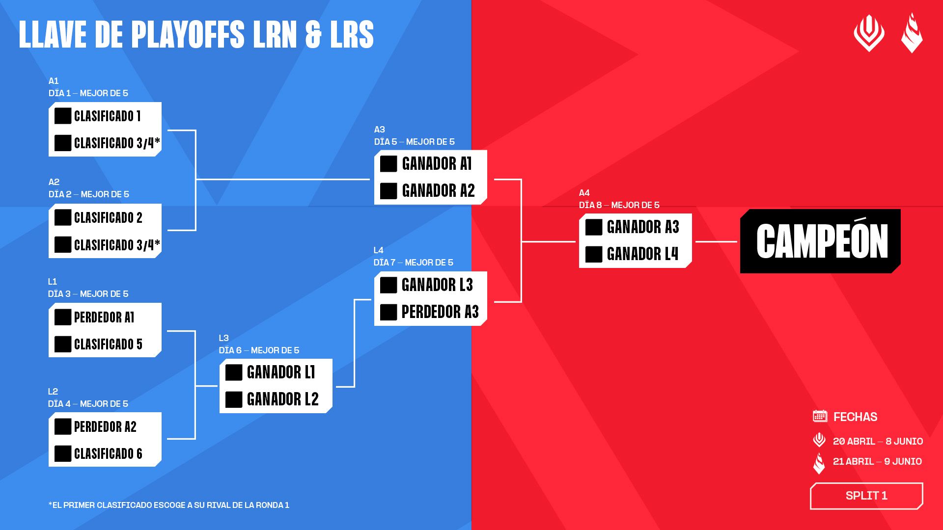 Los Playoffs constarán de una llave de doble eliminación una serie al mejor de cinco de alto riesgo. También regresa Fearless Draft y este año con un nuevo factor. "Primera selección" debuta en la LRN y la LRS en 2026, dando a los equipos más control que nunca. A partir de la temporada regular, los equipos podrán escoger su lado del mapa o decidir si comienzan el reclutamiento primeros o segundos. Para más detalles sobre la primera selección, consulta el anuncio del inicio de la temporada de LoL Esports.