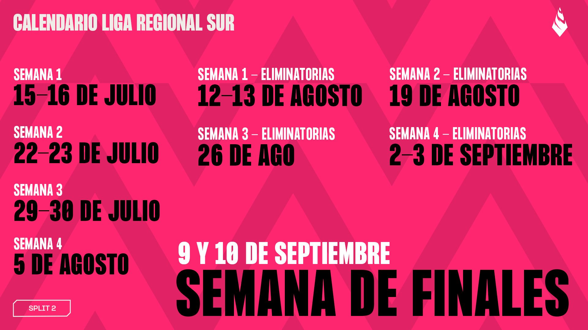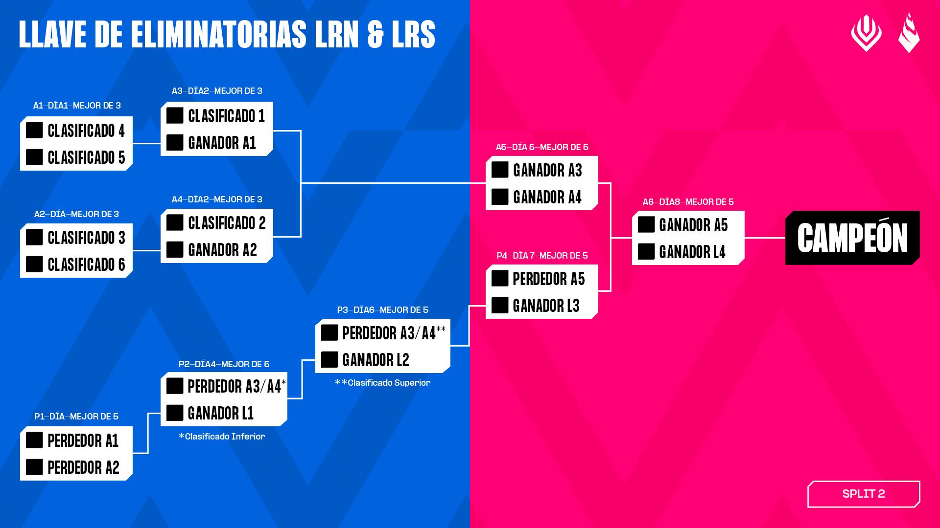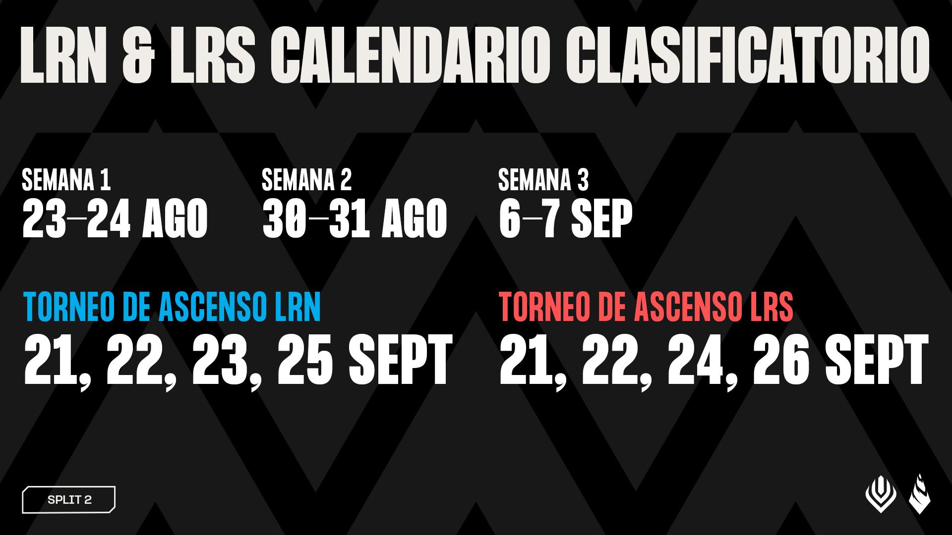 El split 2 de la LRN comienza el domingo 13 de julio, y el split de la LRS comienza el martes 15 de julio. Redujimos la temporada regular a un round robin único al mejor de uno para dejar espacio para una llave masiva de playoffs de eliminación doble con 6 equipos, con una mezcla de series al mejor de tres y de cinco con el formato Full Fearless. La temporada regular será más una clasificatoria para la llave de playoffs que una temporada regular tradicional como las de años anteriores. Dicho eso, hay muchísimo en juego en la temporada regular para los últimos equipos de la LRN y la LRS, ya que deberán defender su posición en la temporada 2026 contra los equipos recién llegados de las clasificatorias abiertas en los torneos de ascenso de la LRN y la LRS. Esto también quiere decir que tendremos los últimos torneos de clasificatorias abiertas del año durante el split 2 de la temporada.