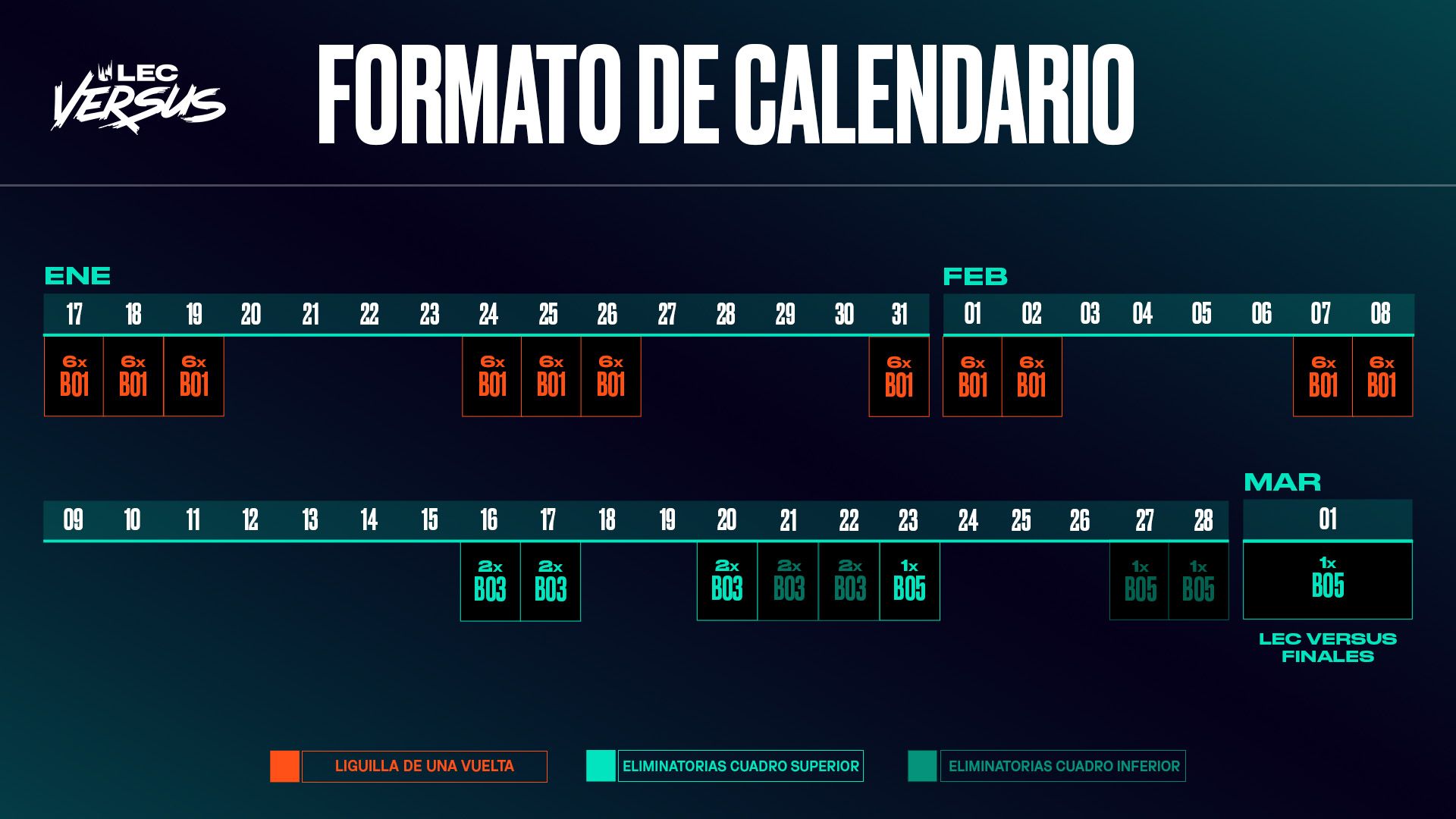 El LEC Versus empezará el 17 de enero con una liguilla de una sola vuelta al mejor de uno en la que todos los equipos se enfrentarán entre sí una vez.