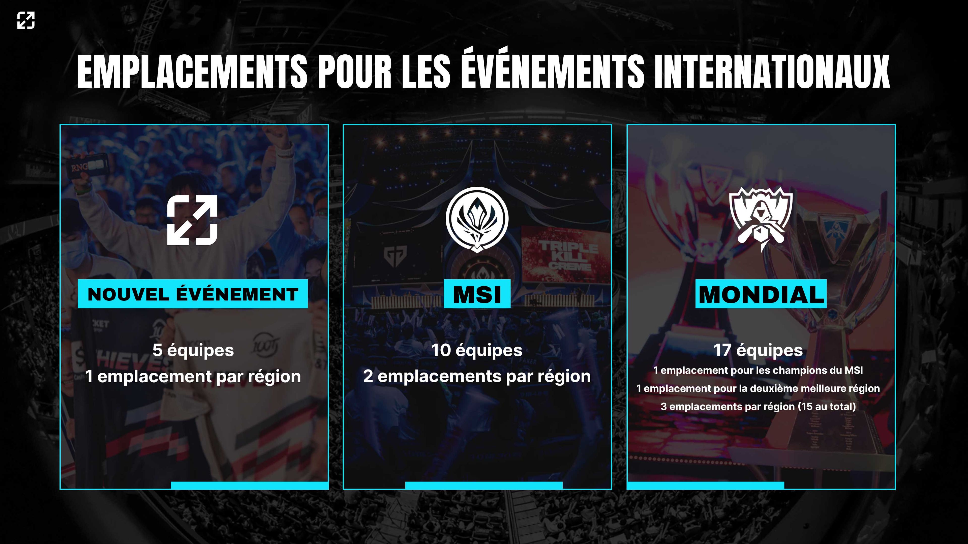 Le passage potentiel à cinq régions au total (Amériques, LEC, LCK, LPL et APAC) nous permet de porter un regard nouveau sur la répartition des places dans nos événements internationaux. Chaque région aurait un emplacement dans notre nouvel événement (5 équipes au total), deux emplacements au MSI (10 équipes au total) et trois emplacements au Mondial. En outre, le champion du MSI et la deuxième meilleure région continueraient à gagner des emplacements supplémentaires pour le Mondial pour leurs ligues, ce qui porterait à 17 le nombre total d'équipes au Mondial. Le Mondial 2025 comprendrait des play-ins sous forme d'un match unique en 3 manches gagnantes. Le vainqueur rejoindrait directement les 15 autres équipes qualifiées dans la phase à système suisse.