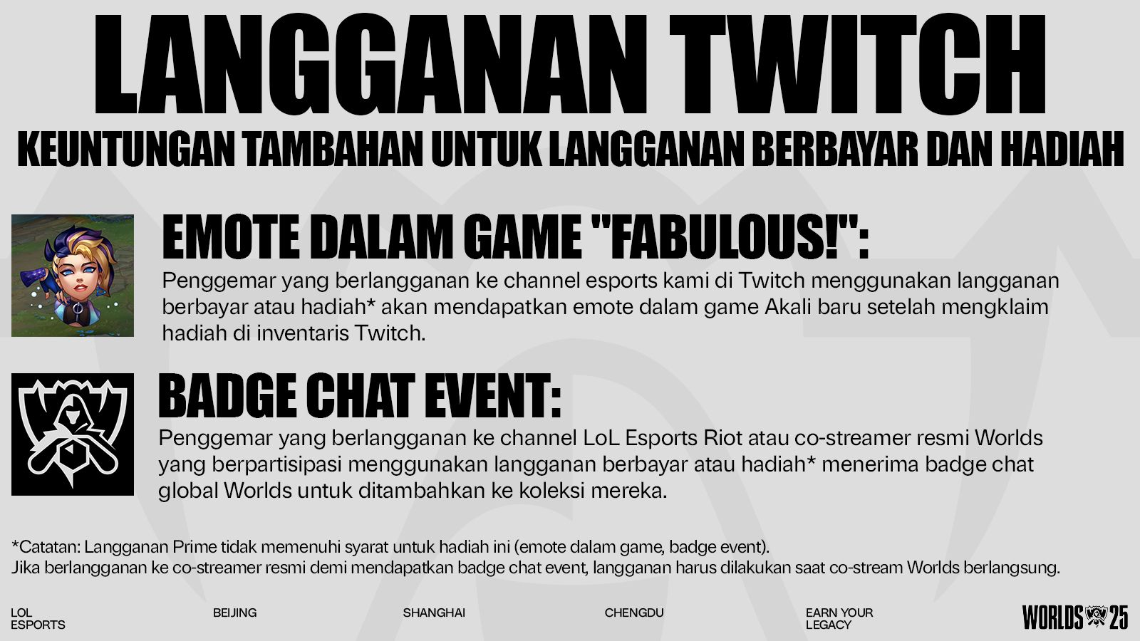 Catatan: Langganan Prime tidak memenuhi syarat untuk hadiah ini (emote dalam game, badge event). Jika berlangganan ke co-streamer resmi demi badge chat event, langganan harus aktif selama co-stream Worlds berlangsung.