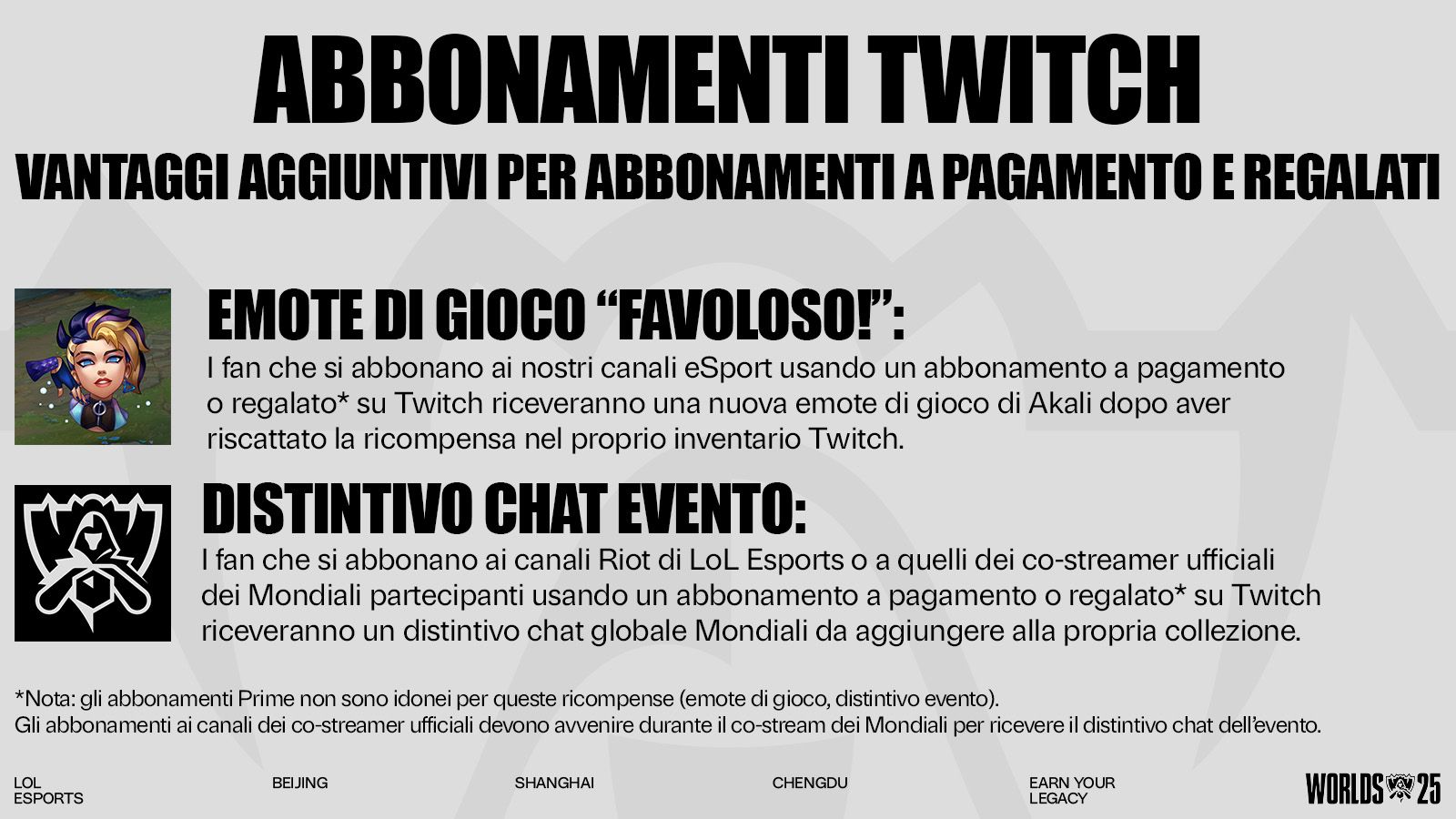 Nota: Gli abbonamenti Prime non sono idonei per queste ricompense (emote di gioco, distintivo evento). Gli abbonamenti ai canali dei co-streamer ufficiali devono avvenire durante il co-stream dei Mondiali per ricevere il distintivo chat dell’evento.