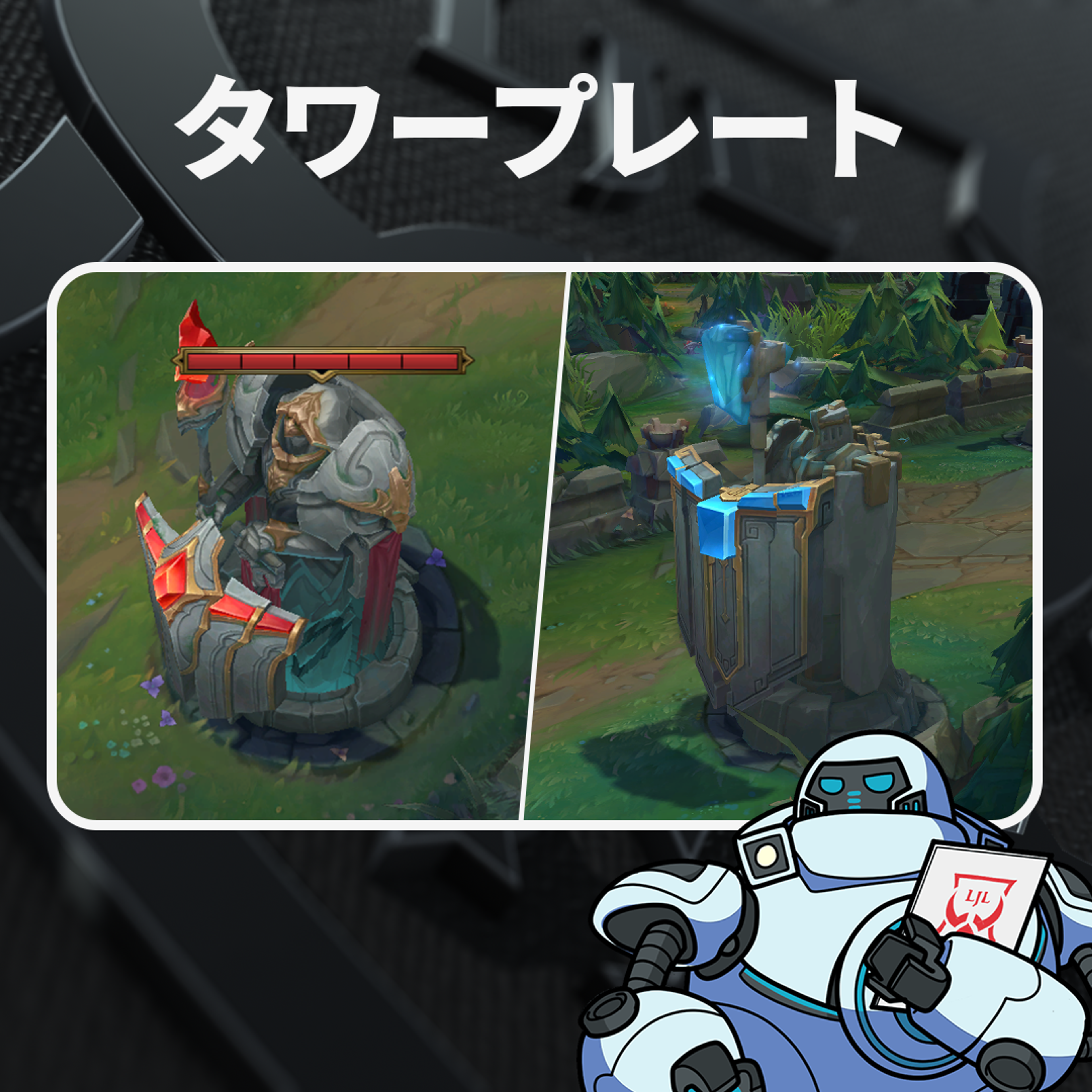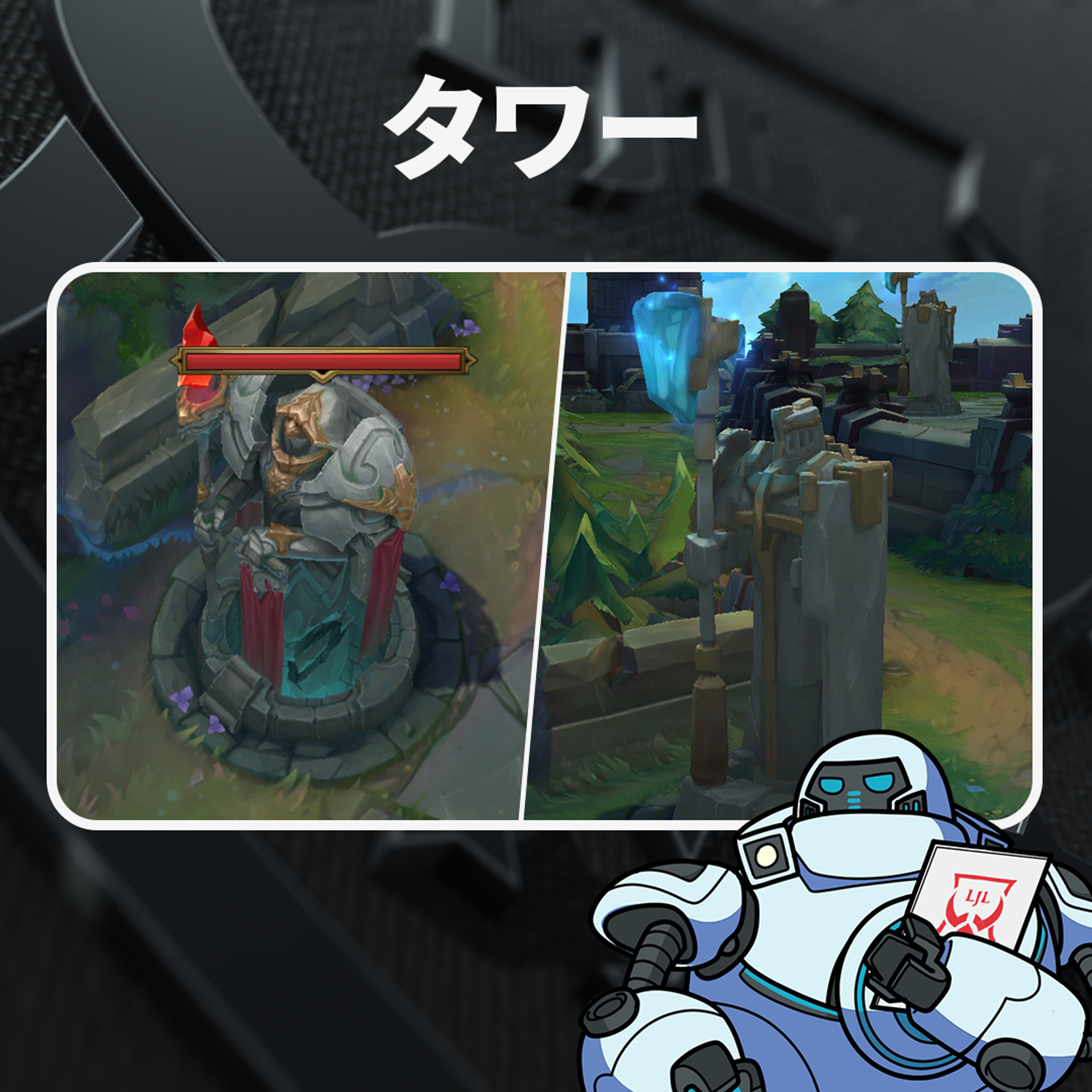 「サモナーズリフト内の各レーンに設置されているオブジェクトだ!タワーからの攻撃ダメージはとても高い為、ミニオンと共に攻撃することが重要。