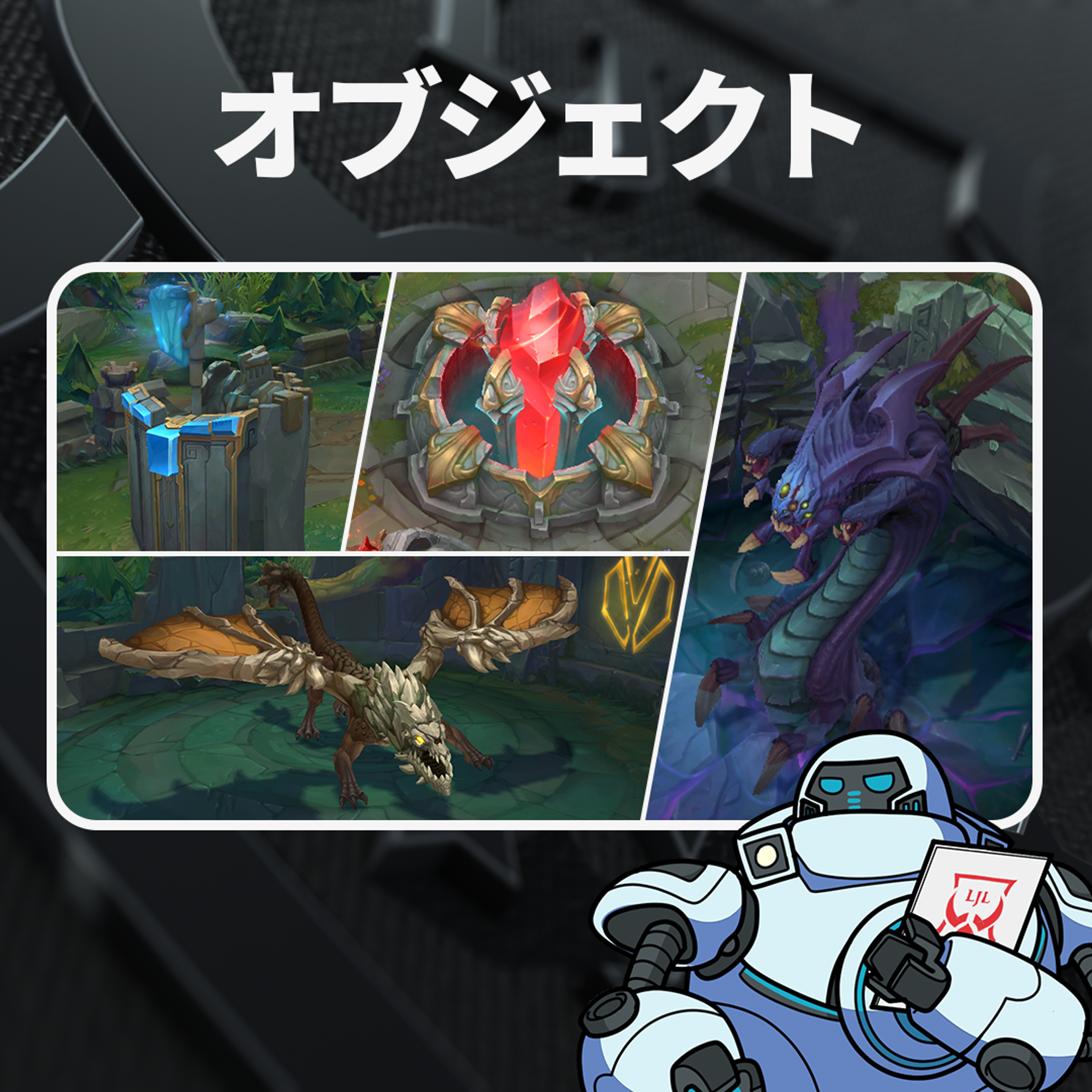 「タワー、ドラゴン、バロン等の試合を動かす為の非常に重要な物の総称だ!マップ上に配置されたオブジェクトを巡ってプレイヤー達は集団戦を起こすぞ。」
