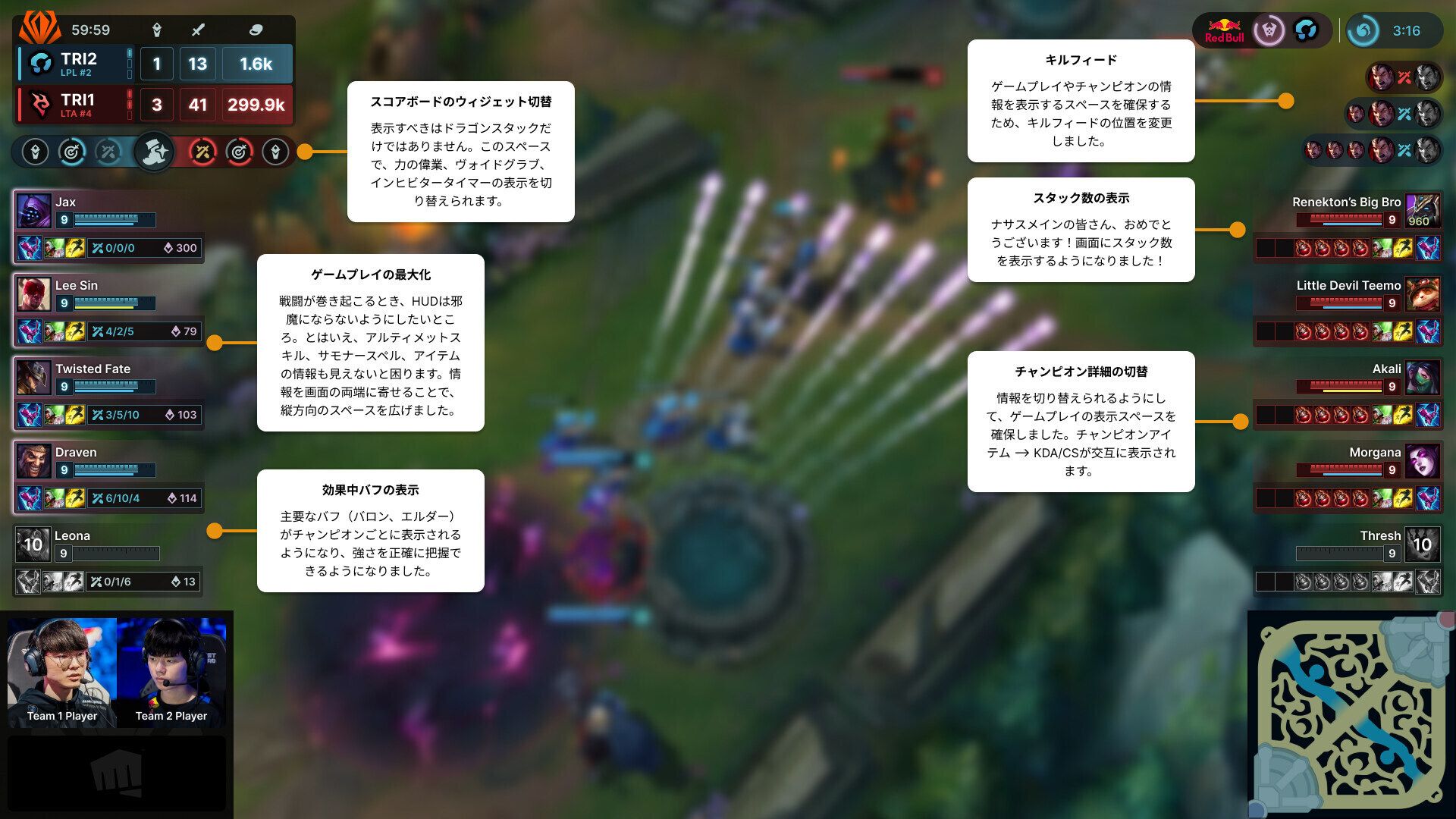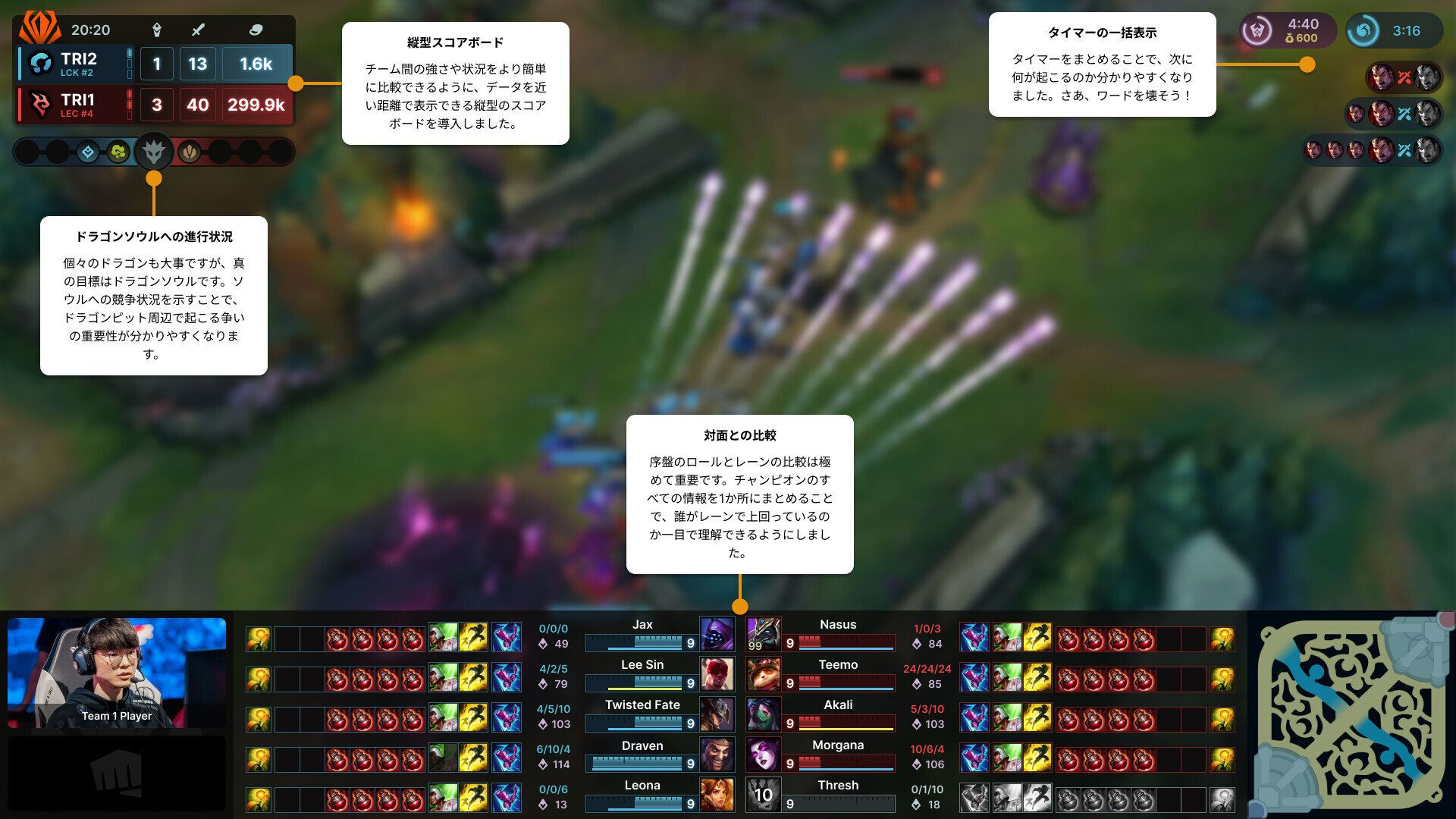 視聴といえば…本大会では新しいHUDによって演出がよりモダンなスタイルへ進化します。これにより、将来のさらなるイノベーションの基盤を築いていきます。私たちはこのアップデートを通じ、配信コンテンツの拡張性、コラボレーションの可能性、持続可能性の各要素を押し広げ、熱心なファンから新規視聴者まですべての人により良い視聴体験をお届けしていきます。