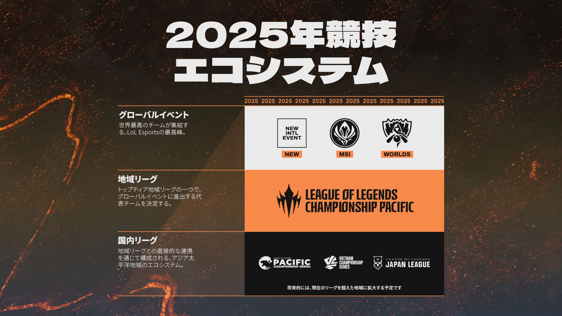 LCPはアジア太平洋地域のエコシステムの一部となり、トップティアの地域大会として機能します。来年はこのリーグが地域内のチームにとって、グローバルイベントに出場するための唯一のルートになります。LCPの直下には、PCS、VCS、LJLが配置されます。これらのリーグは国内での運営を継続し、優れた成績を残したチームは昇格・降格トーナメントを通じてLCPのゲストチーム枠を争います。このトーナメントに関する詳細は近日中に公開されます。