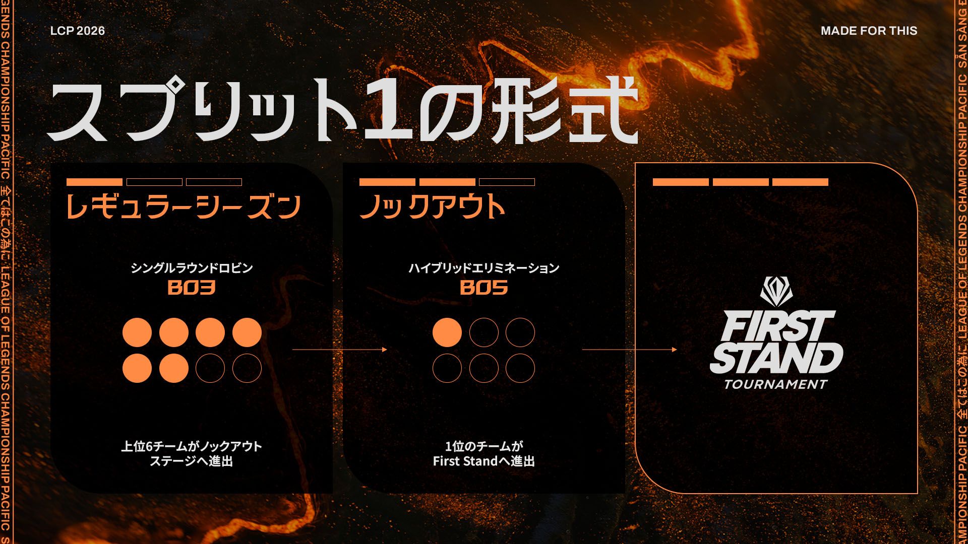 レギュラーシーズンでは、シングルラウンドロビンのBo3形式で対戦が行われます。上位6チームがノックアウトステージへ進出し、ハイブリッドエリミネーションのBo5を戦い、First Stand 2026のLCP代表が決定します。