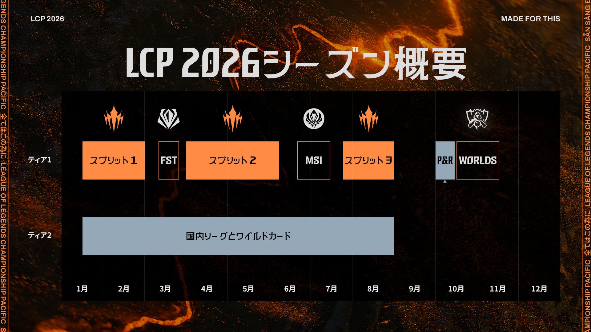 2026年のLCP昇格/降格トーナメント(P&R)で2つのゲストチームはAPAC地域の国内リーグ上位チームと対戦し、自身のリーグ枠を守る必要があります。今回も、フリーフォーオール枠と地域枠が設けられます。今年は、ゲストチームがシーズン中に獲得したチャンピオンシップポイントが、P&Rに参加できるかどうかの基準に影響します。ただし、その年にWorldsへ進出したゲストチームはP&R免除となります。