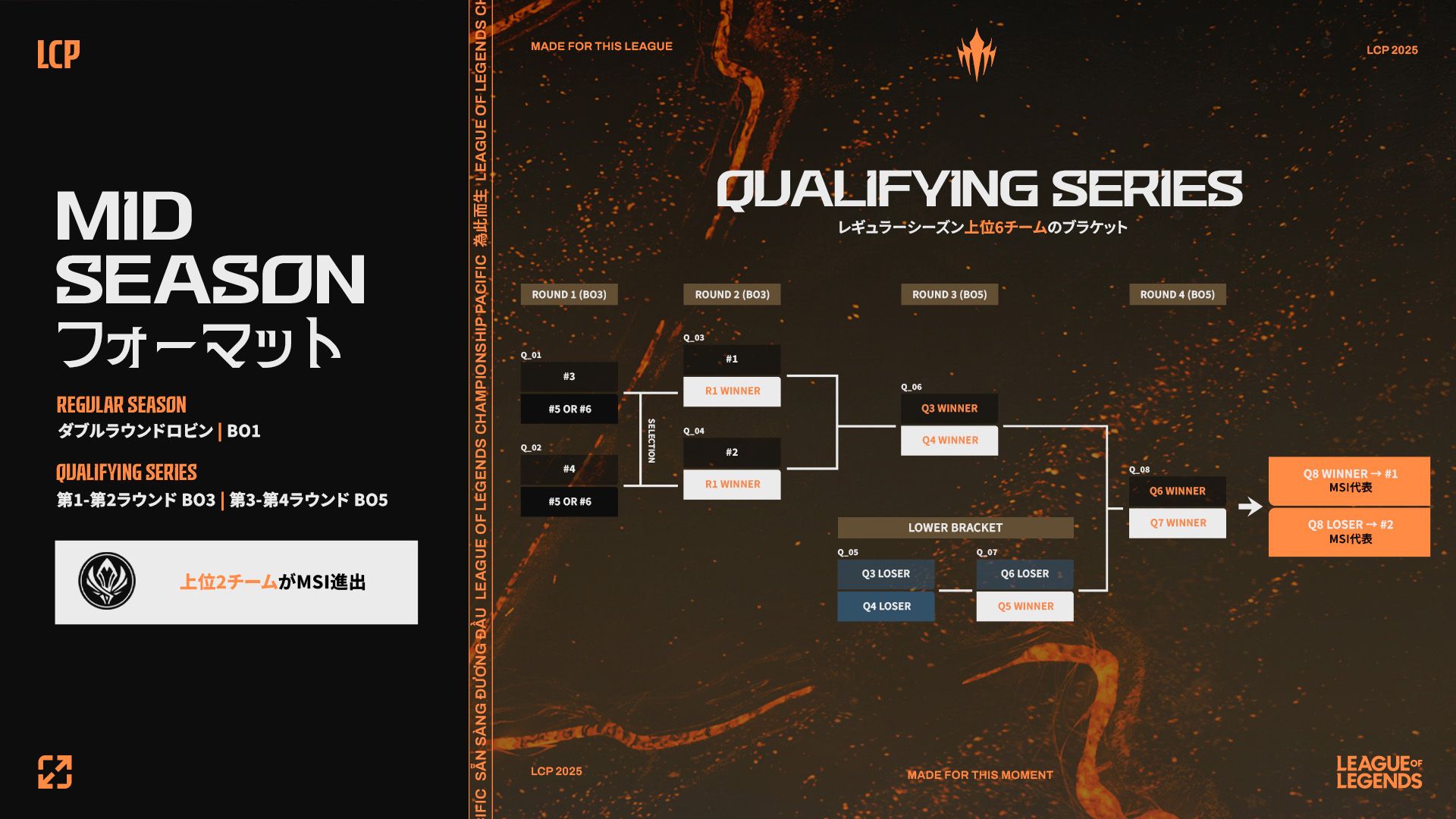 Mid SeasonスプリットのレギュラーシーズンはBO1形式のダブルラウンドロビン(2回の総当たり戦)で、上位6チームがQualifying Seriesに進出します。Qualifying Seriesは第1~2ラウンドがBO3形式、ファイナルラウンドがBO5形式でそれぞれ進行し、上位2チームがMSI出場権を獲得します。またMid Seasonの成績は次のLCPスプリット「Season Finals」のシード順にも影響します。