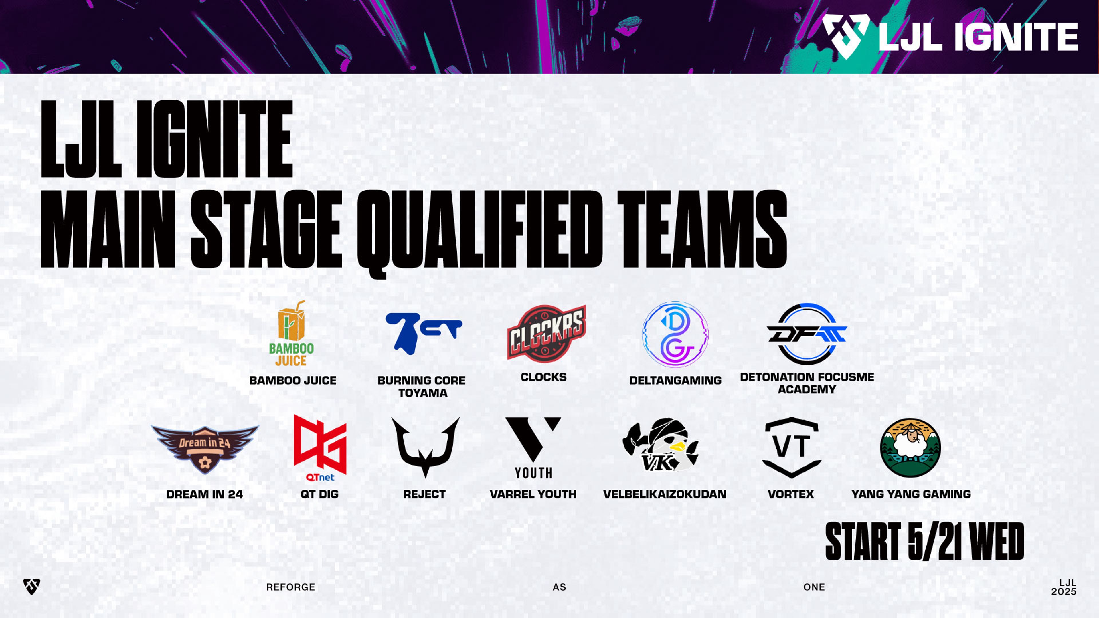 IGNITEのメインステージには、LJL STROMの上位4チーム、LCPアカデミーチーム、そしてオープン予選を勝ち上がった8チームの合計12チームが出場します。