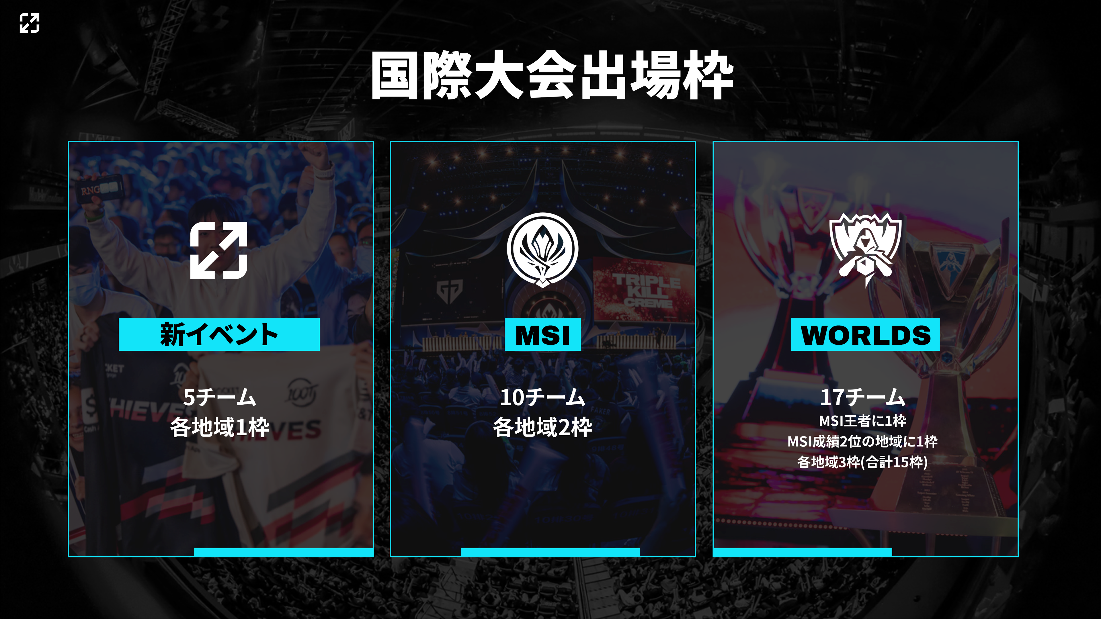 イベントのつながりを維持するため、Mid-Season Invitational(MSI)の出場枠に、この最初のトーナメントの結果も考慮します。[このトーナメントで試験的に使用する大会形式は毎年変わる可能性があり、競技カレンダーの他の大会とは異なるものとなる可能性が高いため、優勝チームが自動的にMSIに進出するわけではありません。]