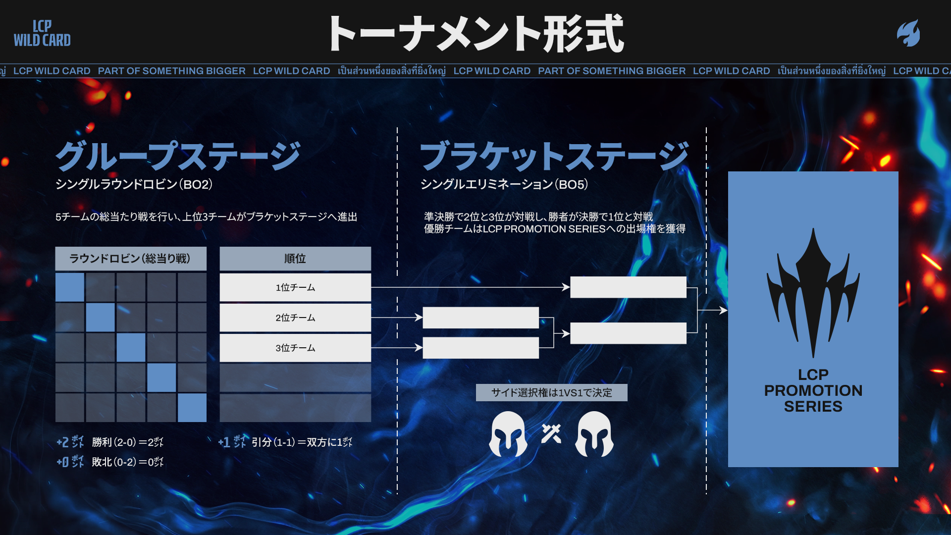 LCPワイルドカード プレイオフでは、5つのチームがシングルラウンドロビンで激突します。各シリーズは2試合で、ポイント制の得点システムで、ブラケットステージに進出する上位3チームを決定します。