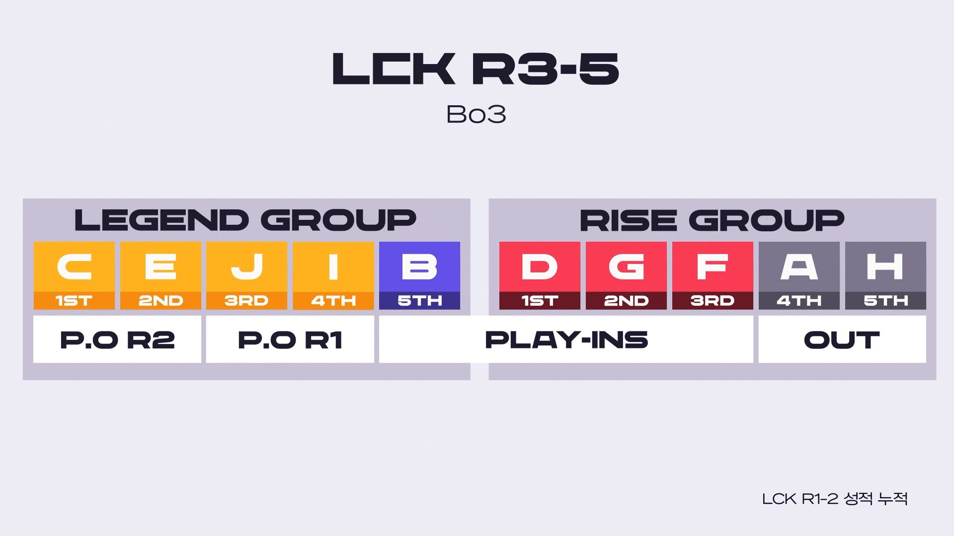 레전드 그룹에서 1, 2위를 차지한 팀은 LCK 플레이오프 2라운드에 직행하고 3위와 4위는 플레이오프 1라운드로 향합니다. 레전드 그룹 5위와 라이즈 그룹 1위부터 3위까지 네 팀은 플레이-인을 치르며 라이즈 그룹 4위와 5위는 시즌을 마감합니다. 3~5라운드는 6주 동안 진행되고 한 해 농사를 마무리하는 포스트 시즌에 돌입합니다.